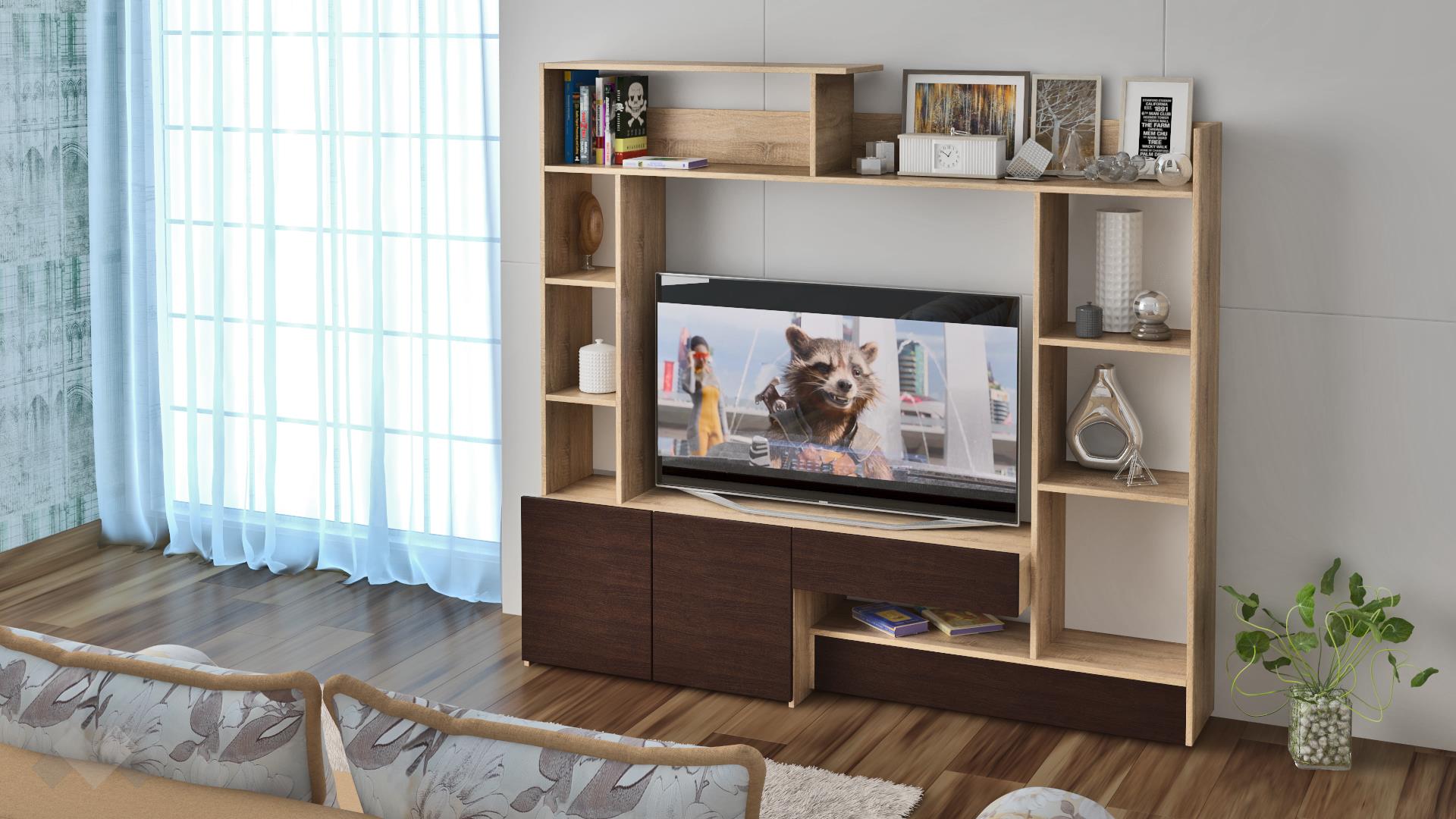 ⭐ Предимства: ✓ компактна и функционална ✓ практично разпределение ✓ семпъл и елегантен дизайн ✓ комбинация от класически светъл и тъмен декор ✓ подходяща и за по-малки жилища ✓ открити рафтове ✓ етажерка ✓ ТВ шкаф с място за ТВ - 104/90 см ✓ чекмедже ✓ качествена изработка ✓ 16 мм ПДЧ