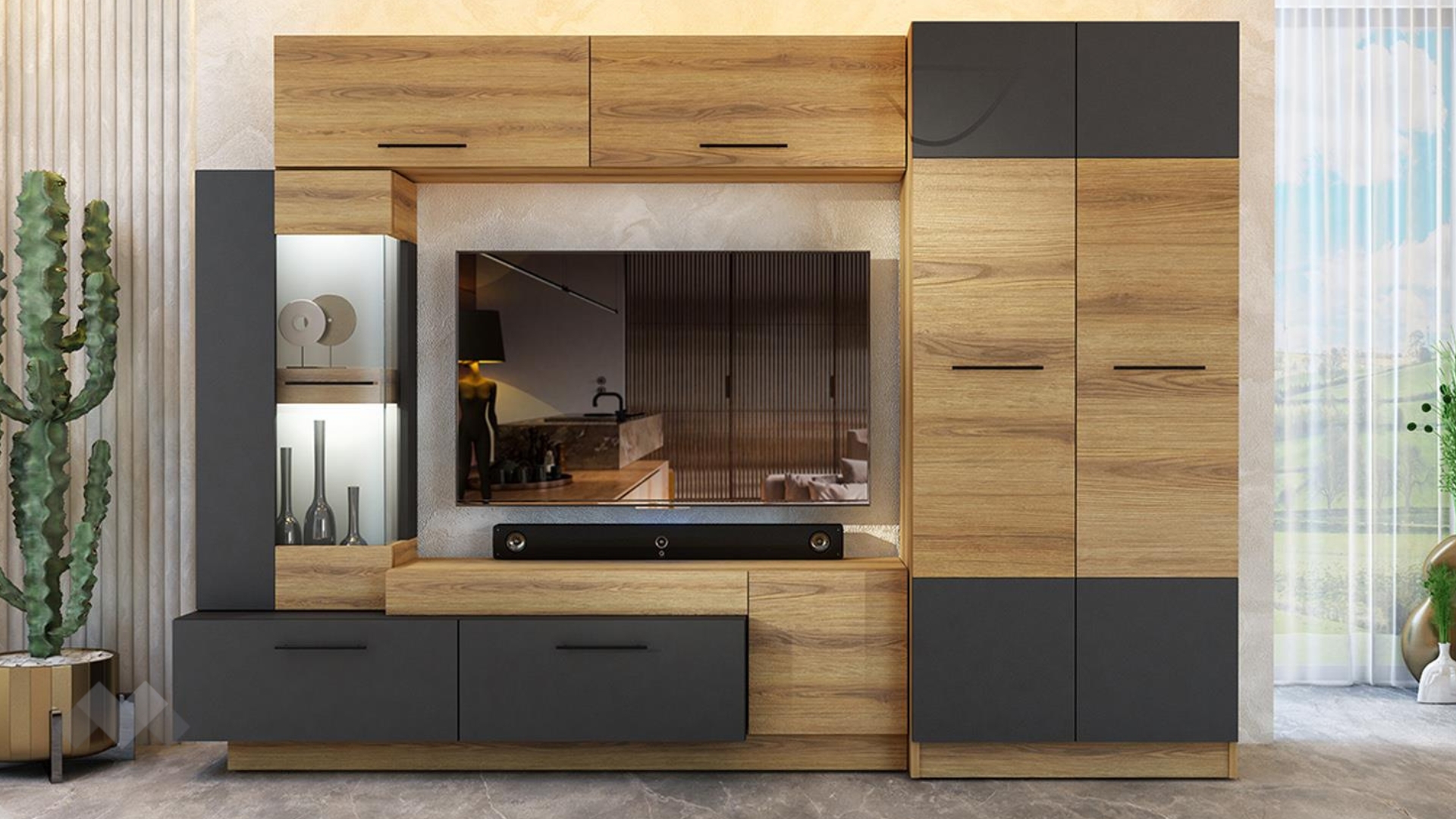 Тази стилна модулна секция съчетава съвременен дизайн и изключителна функционалност – перфектният акцент за всяка модерна дневна. Изработена в топъл дървесен декор с елегантни матови антрацитни елементи, тя създава усещане за уют, ред и баланс.