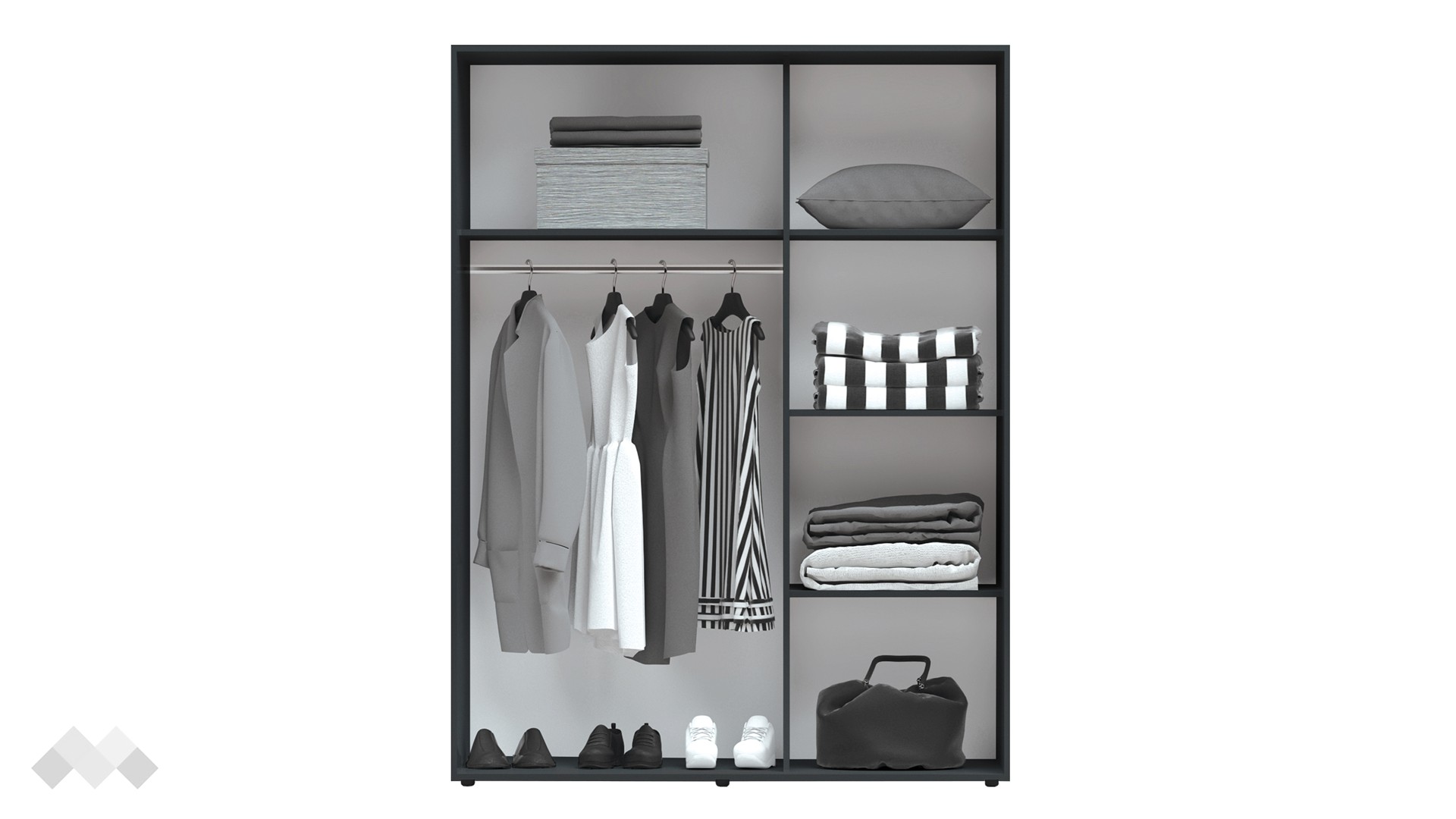 От дясната страна на гардероба са разположени три рафта, на които можеш да подредиш сгънати дрехи, завивки, възглавници, аксесоари или други необходими вещи. От лявата страна ще откриеш широк рафт, както и лост за закачалки, подходящ за палта, по-обемни връхни дрехи или елегантното облекло, което се мачка лесно.