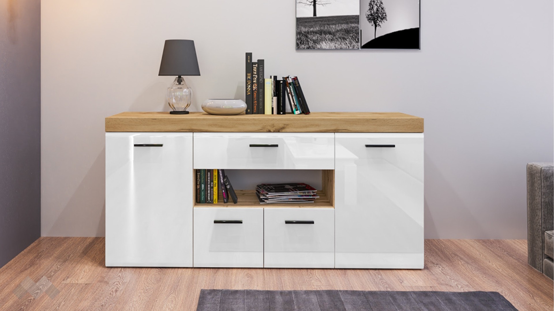 Изработен е от висококачествени 18 мм МДФ и 16 мм ламинирано ПДЧ плоскости за по-голяма здравина и стабилност. Цветовата комбинация е от бяло гланц и дъб дакота.