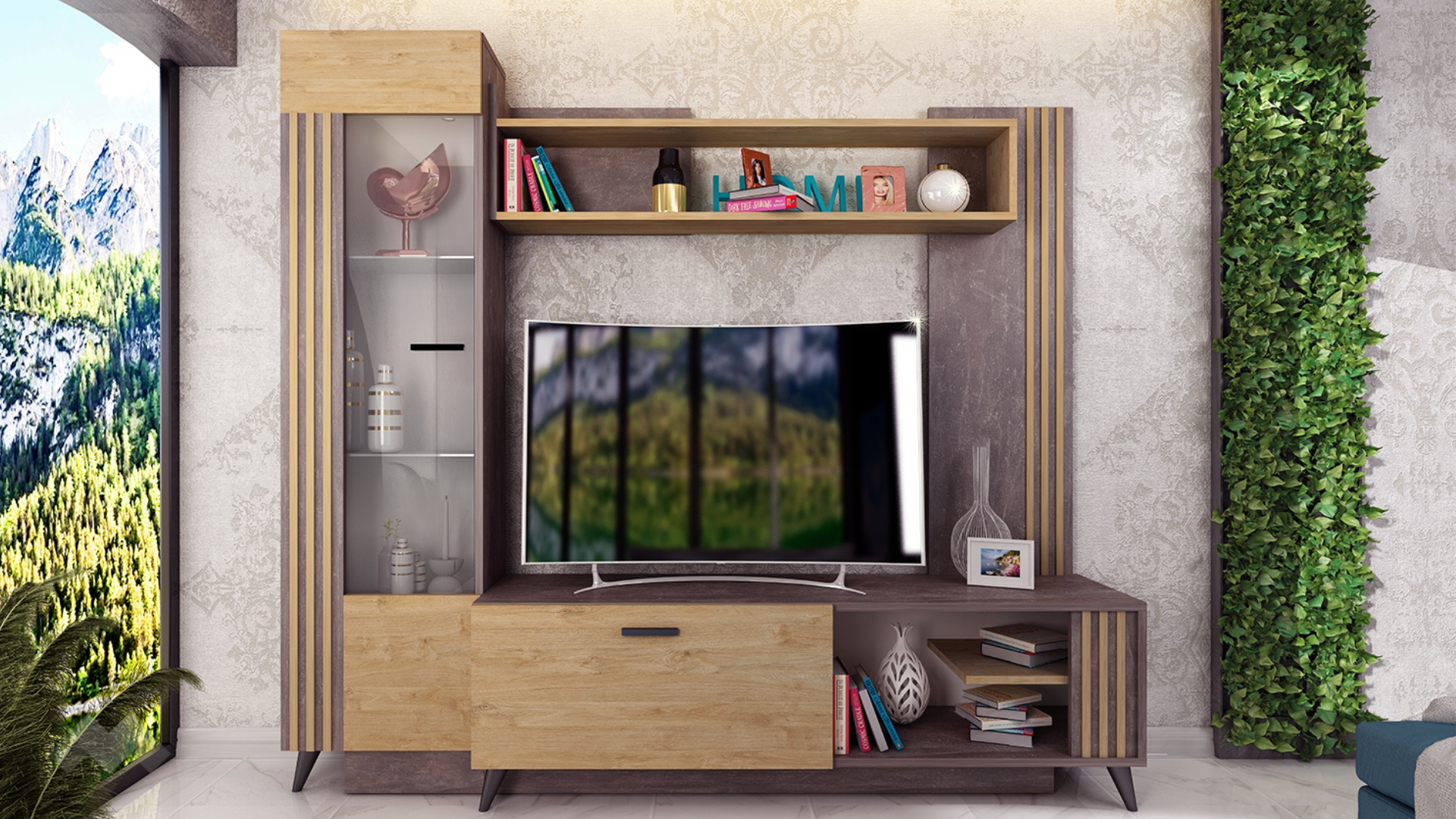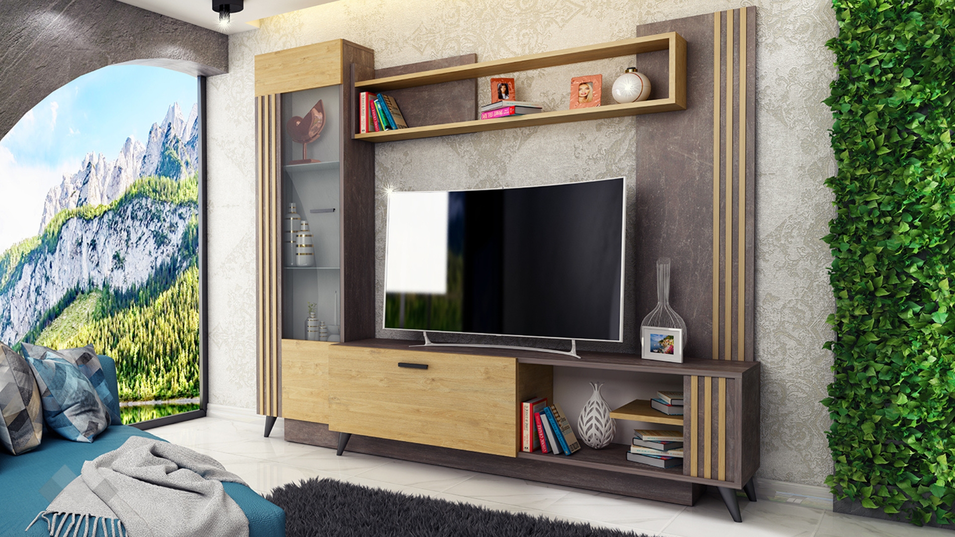 ⭐ Предимства: ✓ модерен и стилен дизайн ✓ асиметричен дизайн ✓ качествена изработка ✓ ТВ шкаф ✓ отворени шкафове ✓ етажерка ✓ витринен шкаф ✓ 16 мм ПДЧ