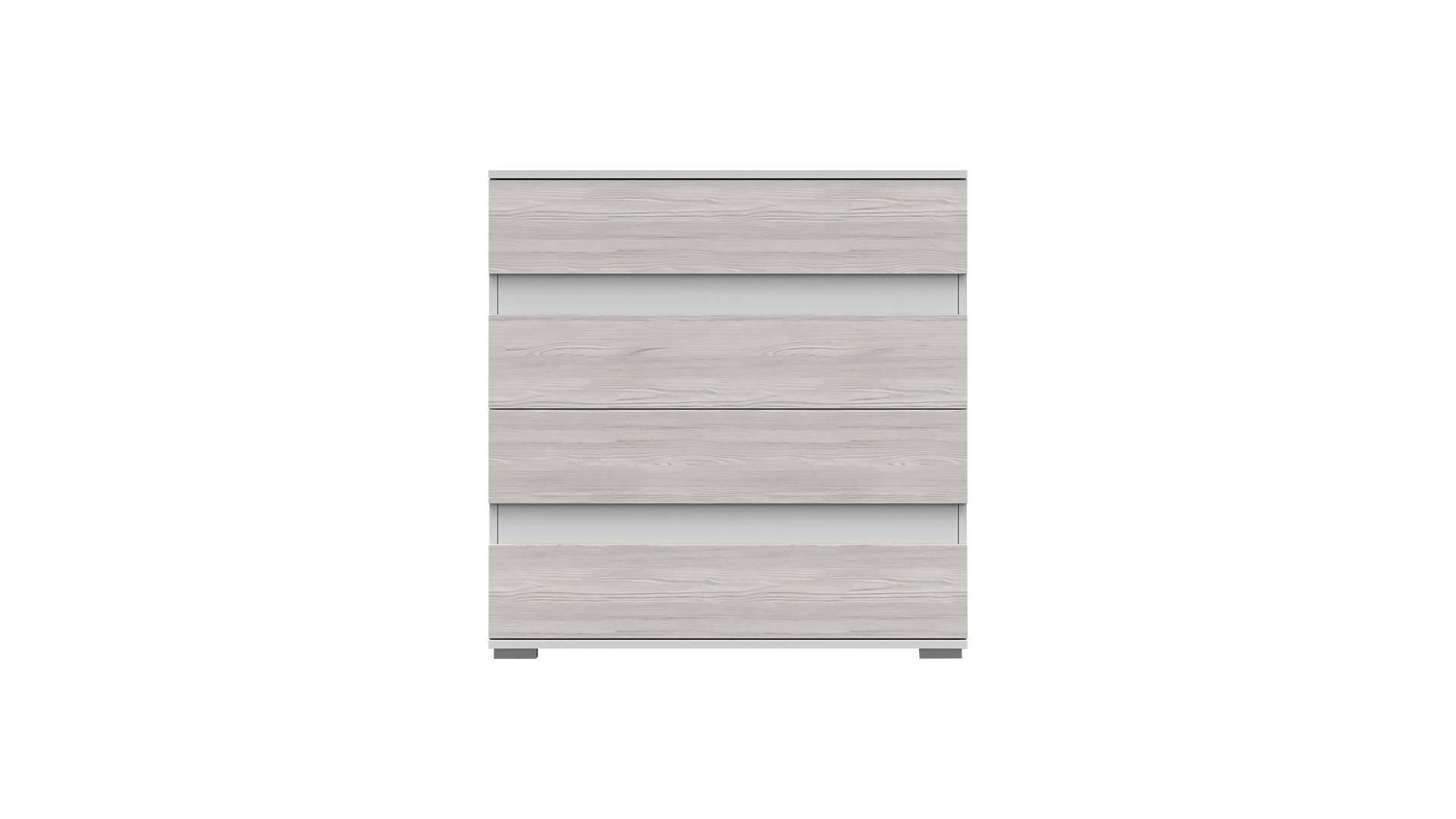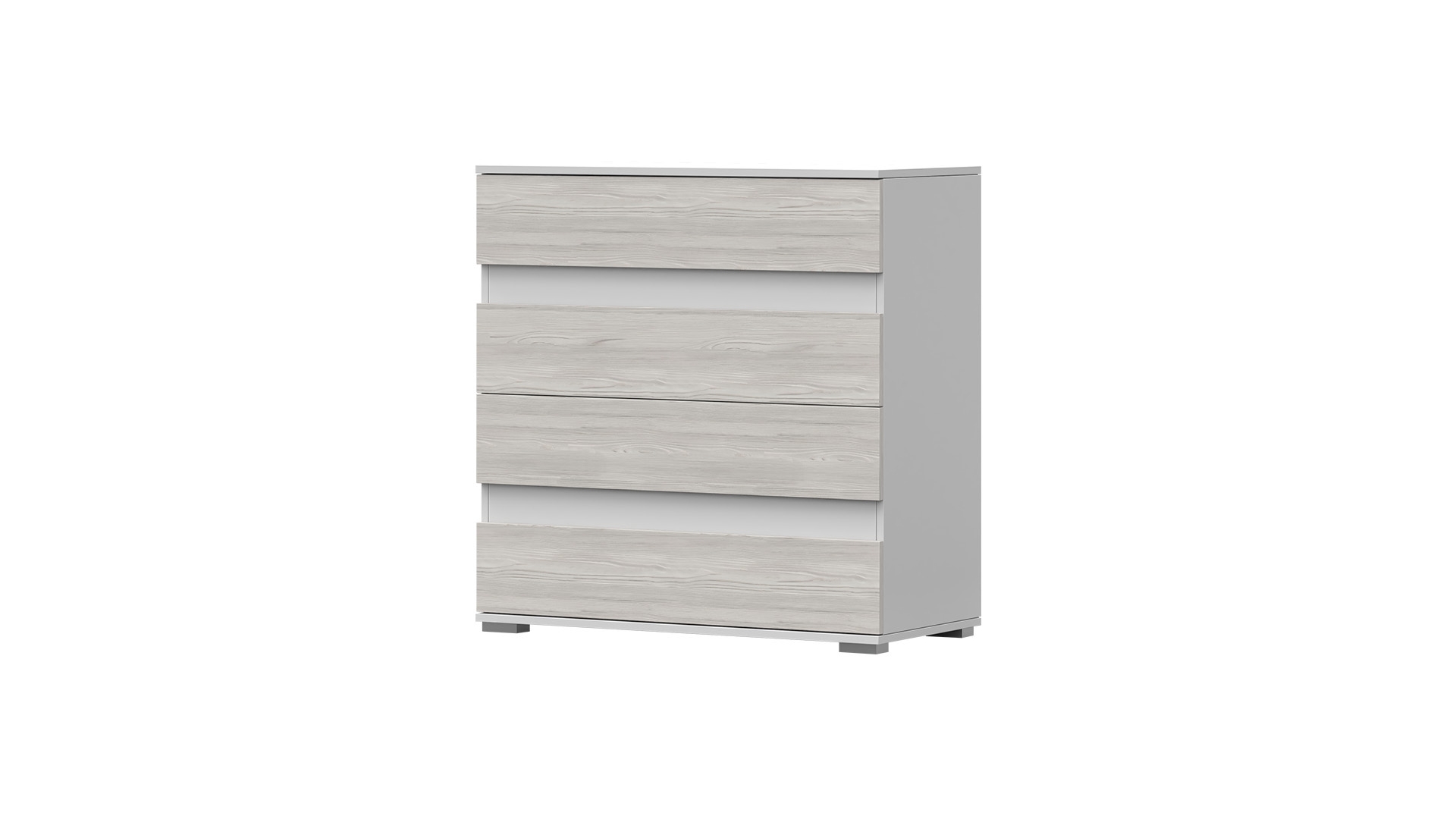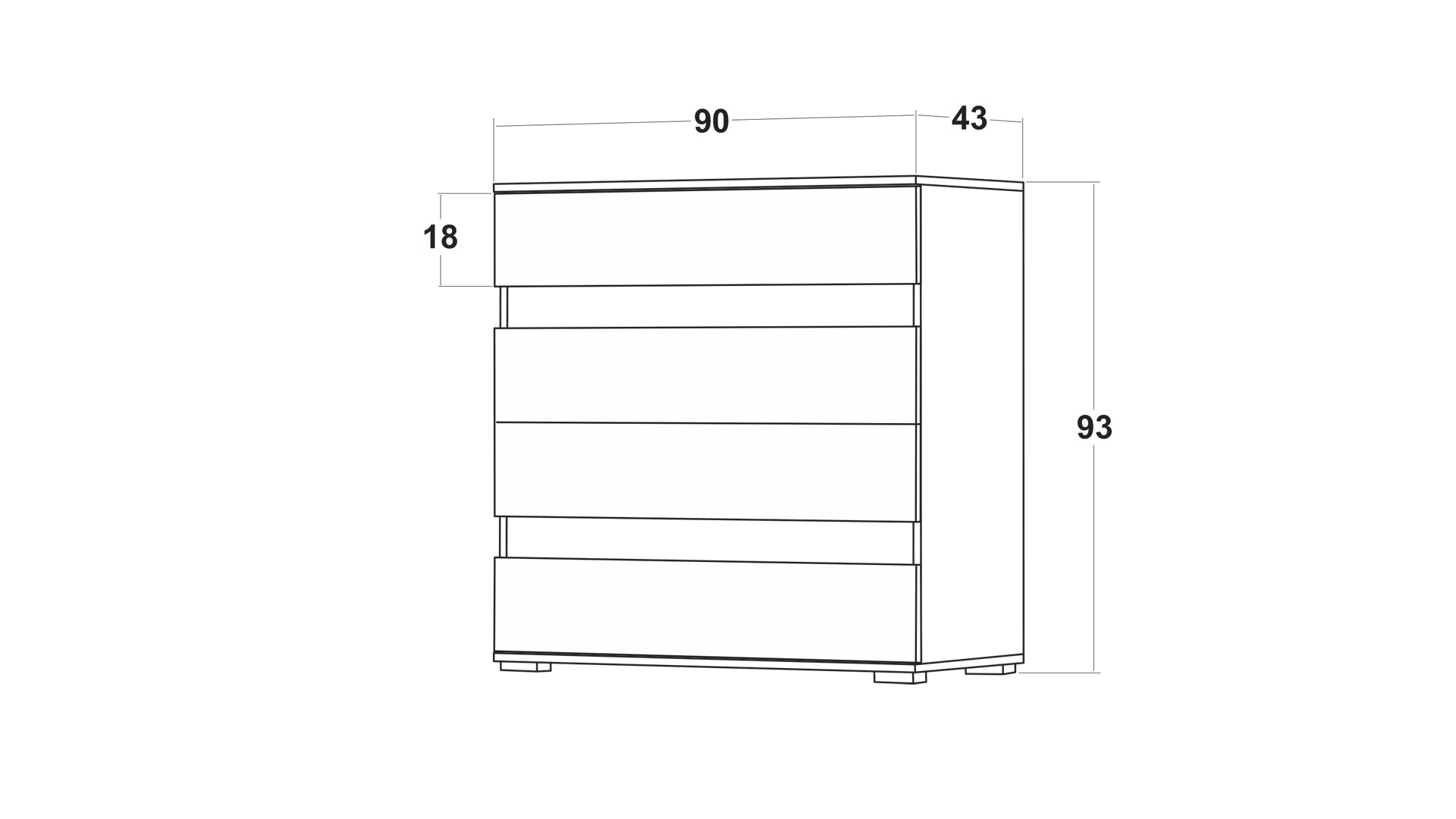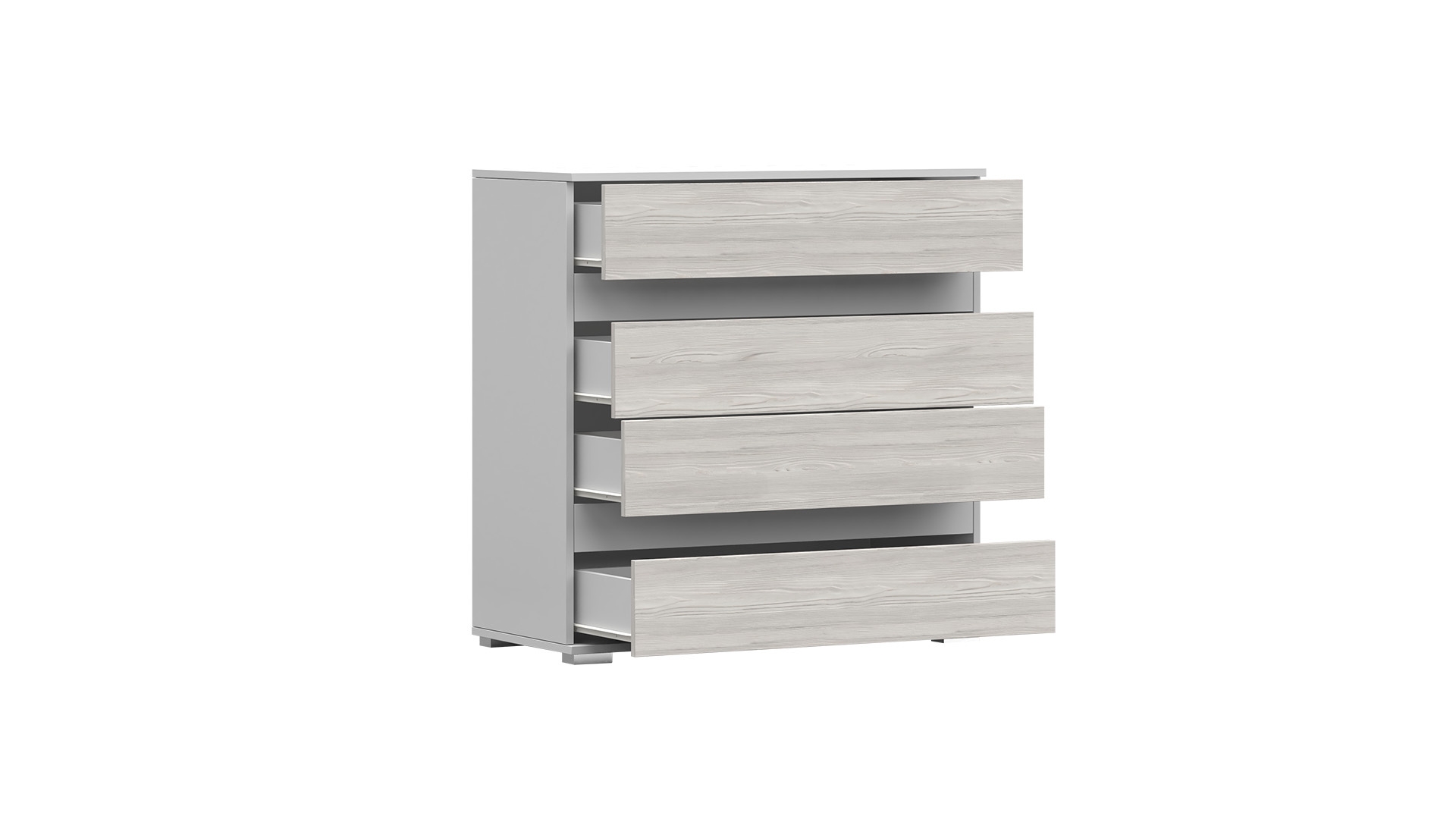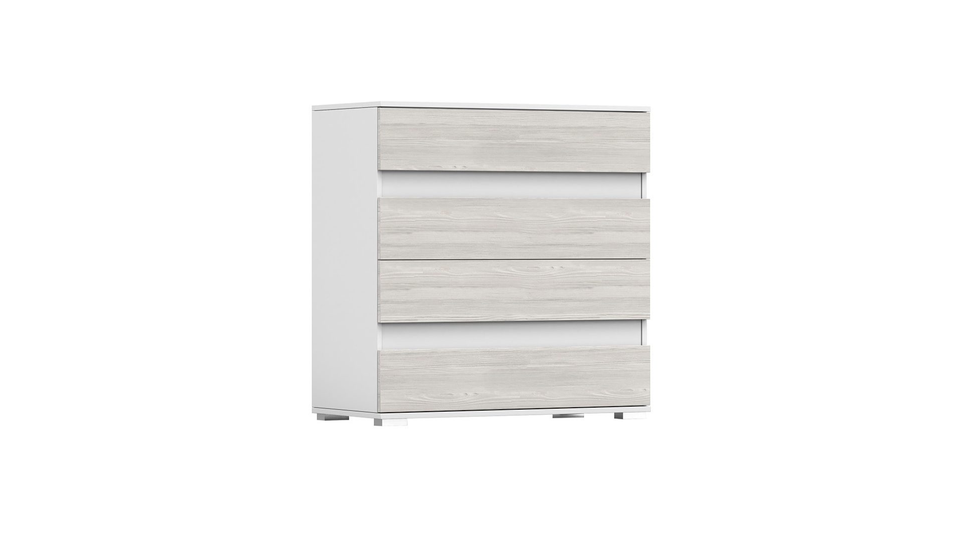 Моделът разполага с четири чекмеджета, които предоставят удобно място за съхранение на дрехи, бельо, аксесоари или документи. Горният плот е подходящ за поставяне на декоративни елементи или осветление.