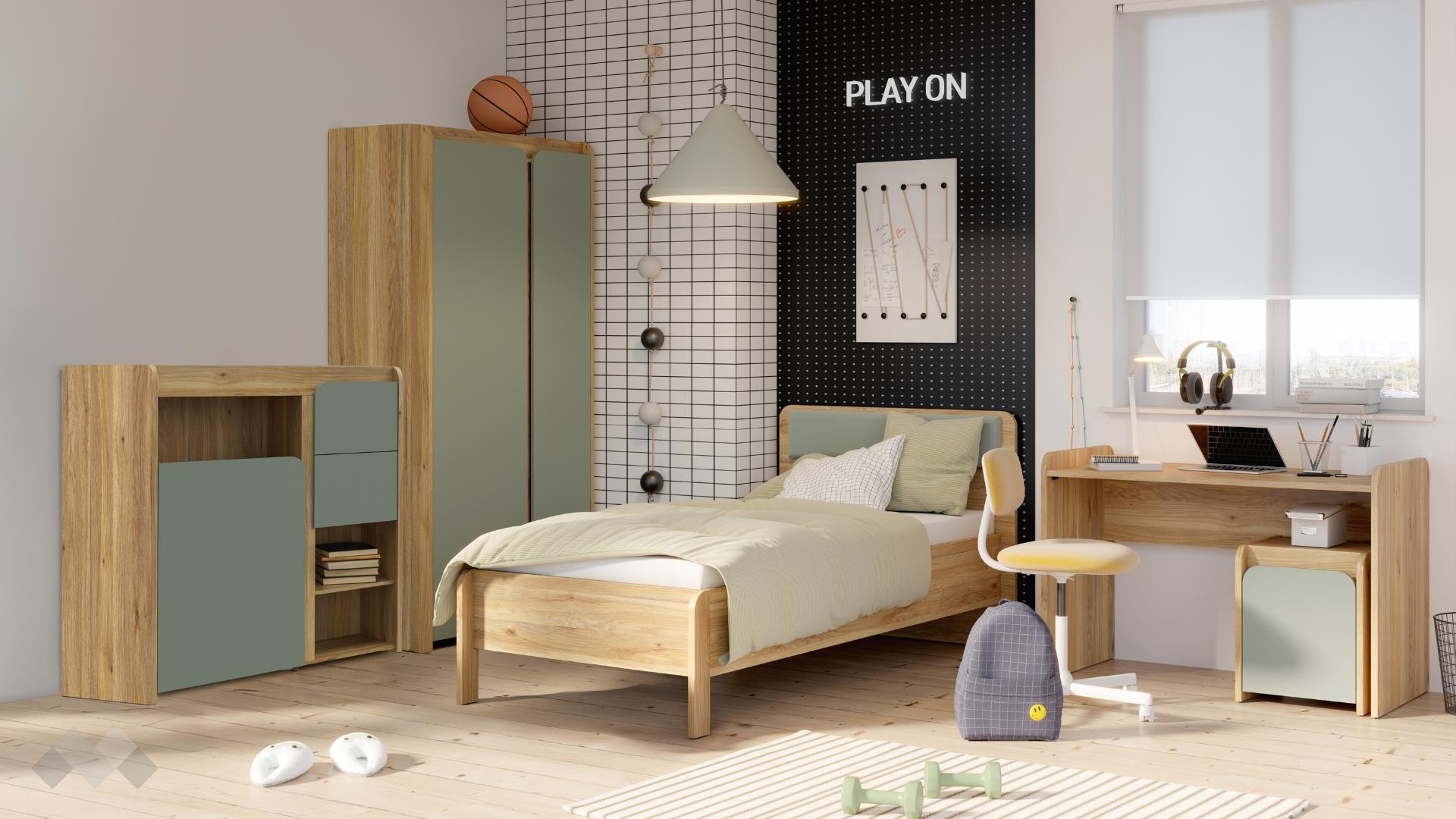 Спален комепкт Холис съчетава стилна визия с комфорт и практичност, като осигурява удобно място за сън, съхранение на вещи и пространство за учене, без да заема излишно пространство.