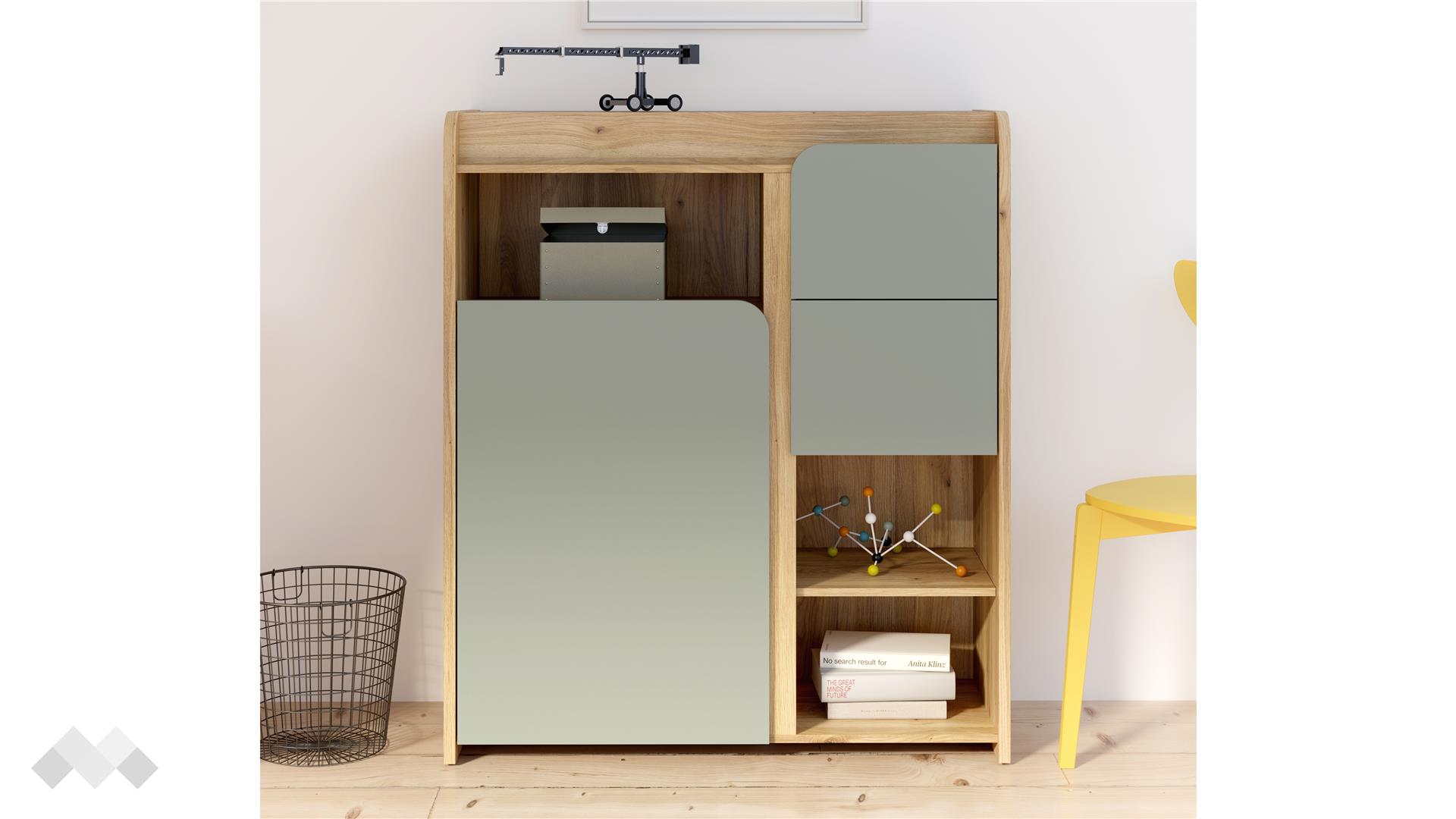 Скринът съчетава елегантна визия и практично вътрешно разпределение, подходящо за разнообразни нужди у дома. Разполага с един шкаф за по-обемни предмети, две чекмеджета за дребни вещи и няколко открити рафта – идеални за декорации, книги или ежедневни принадлежности.