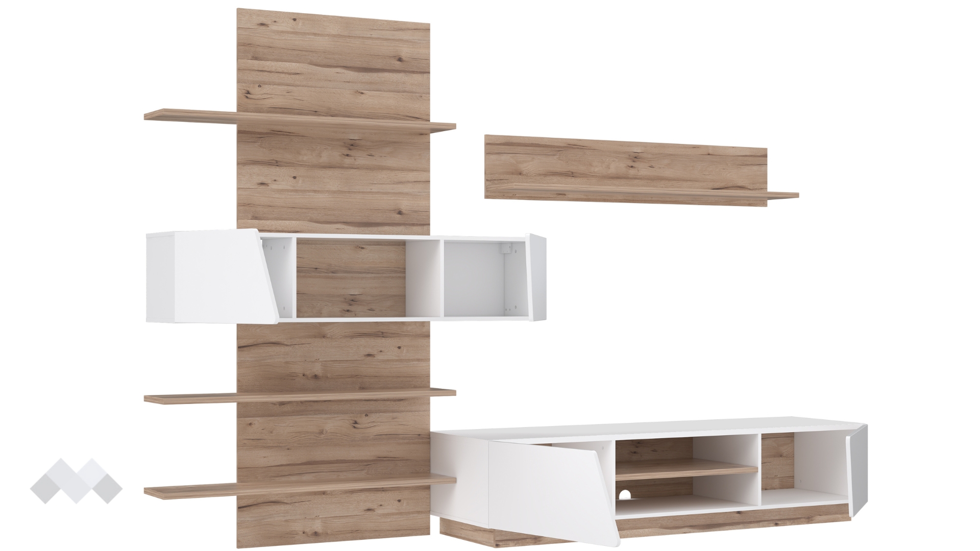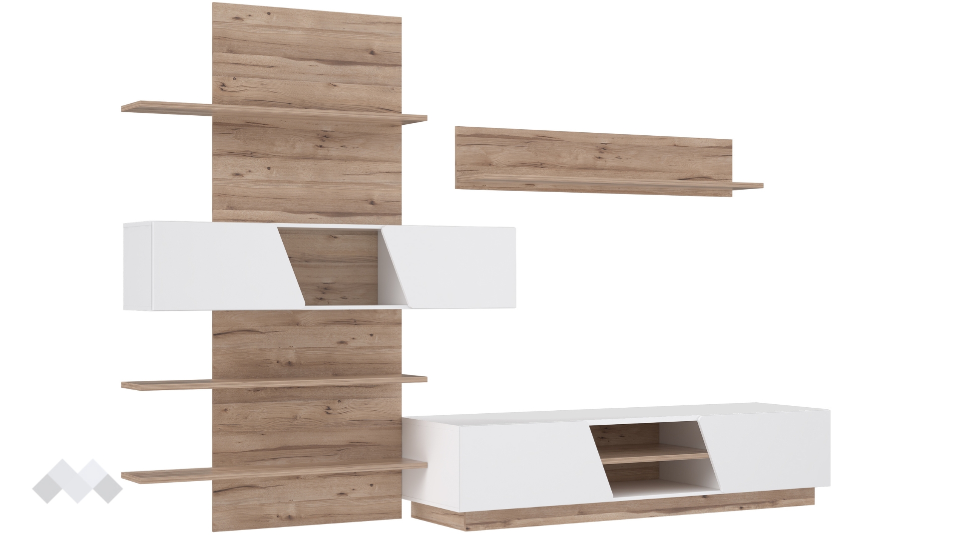 Централната зона е предвидена за телевизор, като е обградена от удобни модули за подреждане на техника, аксесоари и декорации. Със своя впечатляващ размер и функционално разпределение, секция Хулон е отличен избор за по-просторни всекидневни, където стилът и удобството вървят ръка за ръка.