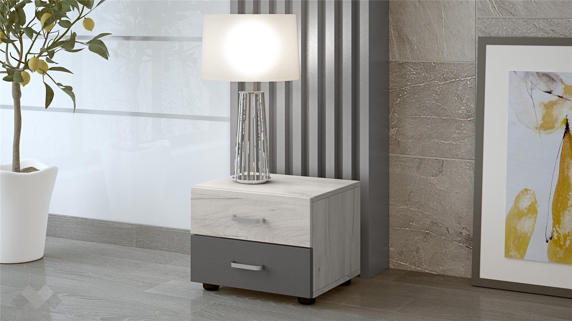 Спалнята е достатъчно голяма, за да ти предостави нужното пространство и комфорт на спане, подходяща за матрак с размер 160/200 см. Таблата е декорирана с акцент в цвят антрацит. Спален комплект Ибиза включва и две нощни шкафчета с две чекмеджета. Идеални са за нощни лампи, декорации или просто книгата, която четеш.