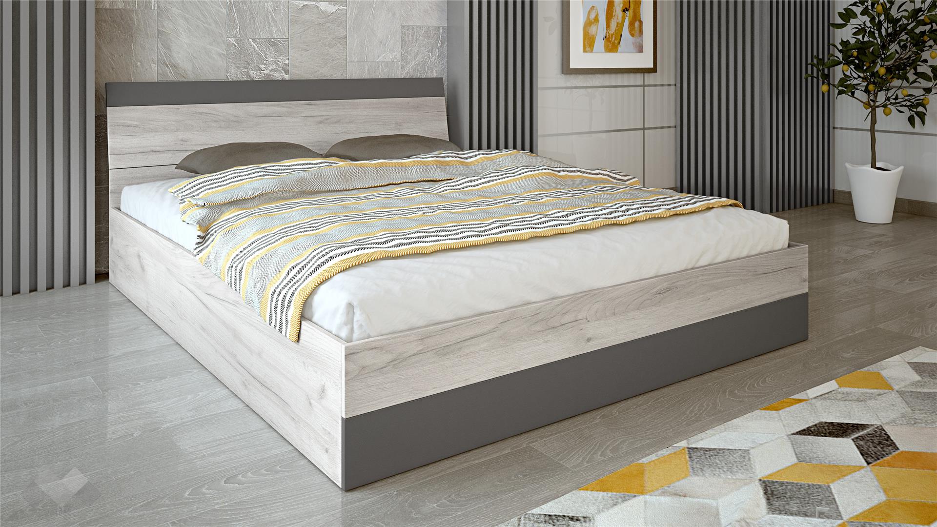 Спалният комплект е без включен механизъм за повдигане на матрака. Ако желаеш да използваш пространството под матрака като допълнително място за съхранение, може да закупиш комплект механизъм за повдигане на матрака. Изработен е от висококачествено 16 мм ПДЧ, гарант за дълготрайна употреба.