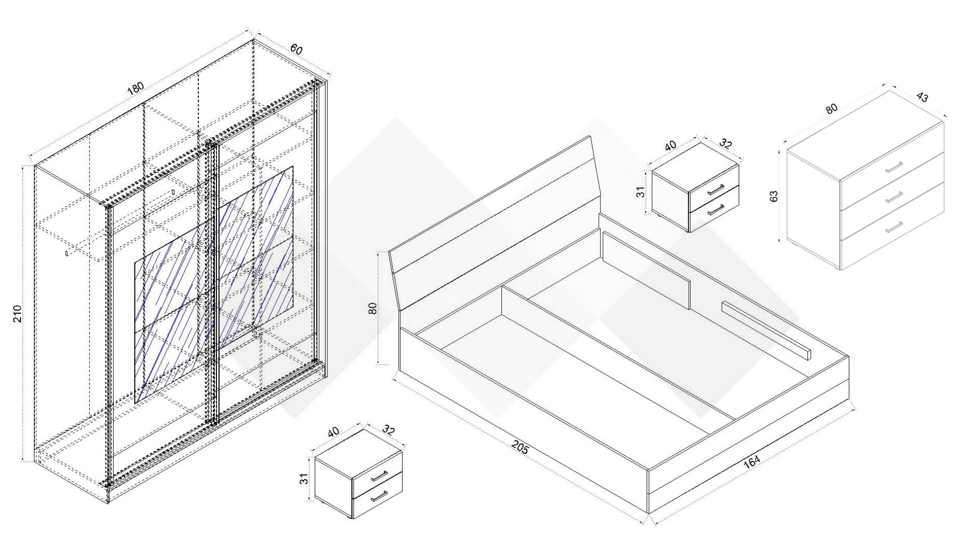 Спалня: Д: 205 см Ш: 164 см В: 80 см
