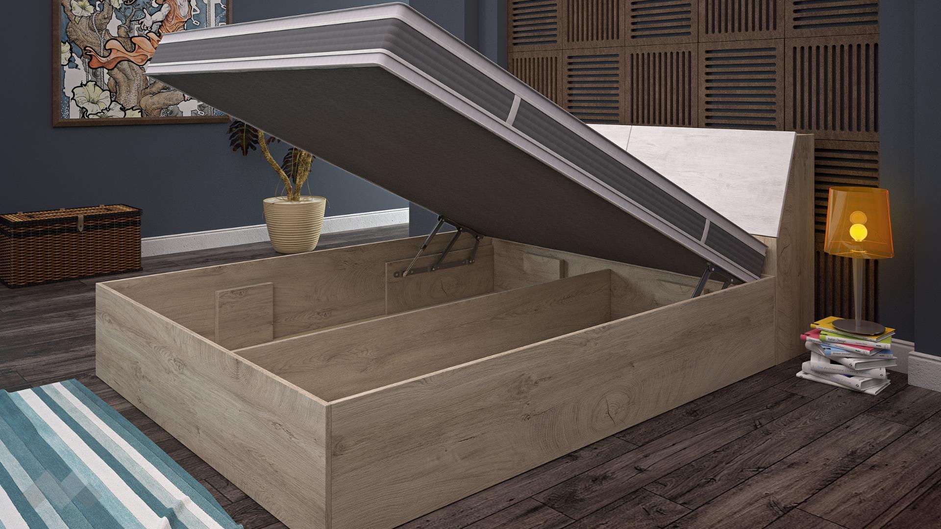 Спалнята е с включен механизъм за повдигане на матрака. Подходяща е за еднолицев и двулицев матрак, които можеш да избереш тук: Матраци.
