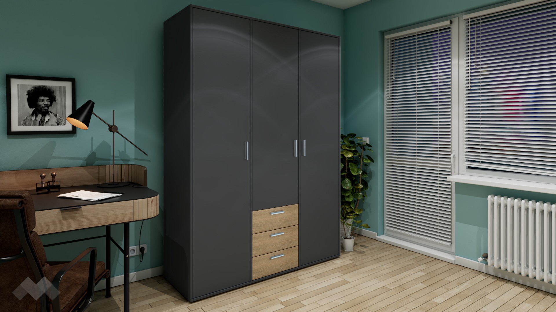 Този гардероб радва със своята практичност. На твое разположение са два лоста за закачалки в крайните крила, четири рафта за съхранение на дрехи или вещи и три чекмеджета в средното крило на гардероба. Така всичко ще бъде перфектно организирано.