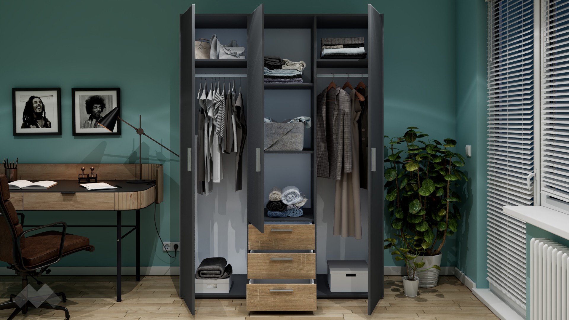 ⭐ Предимства: ✓ трикрилен ✓ 3 чекмеджета ✓ 4 рафта ✓ 2 лоста за закачалки ✓ модерен декор ✓ практично разпределение ✓ качествена изработка ✓ 16 мм ПДЧ