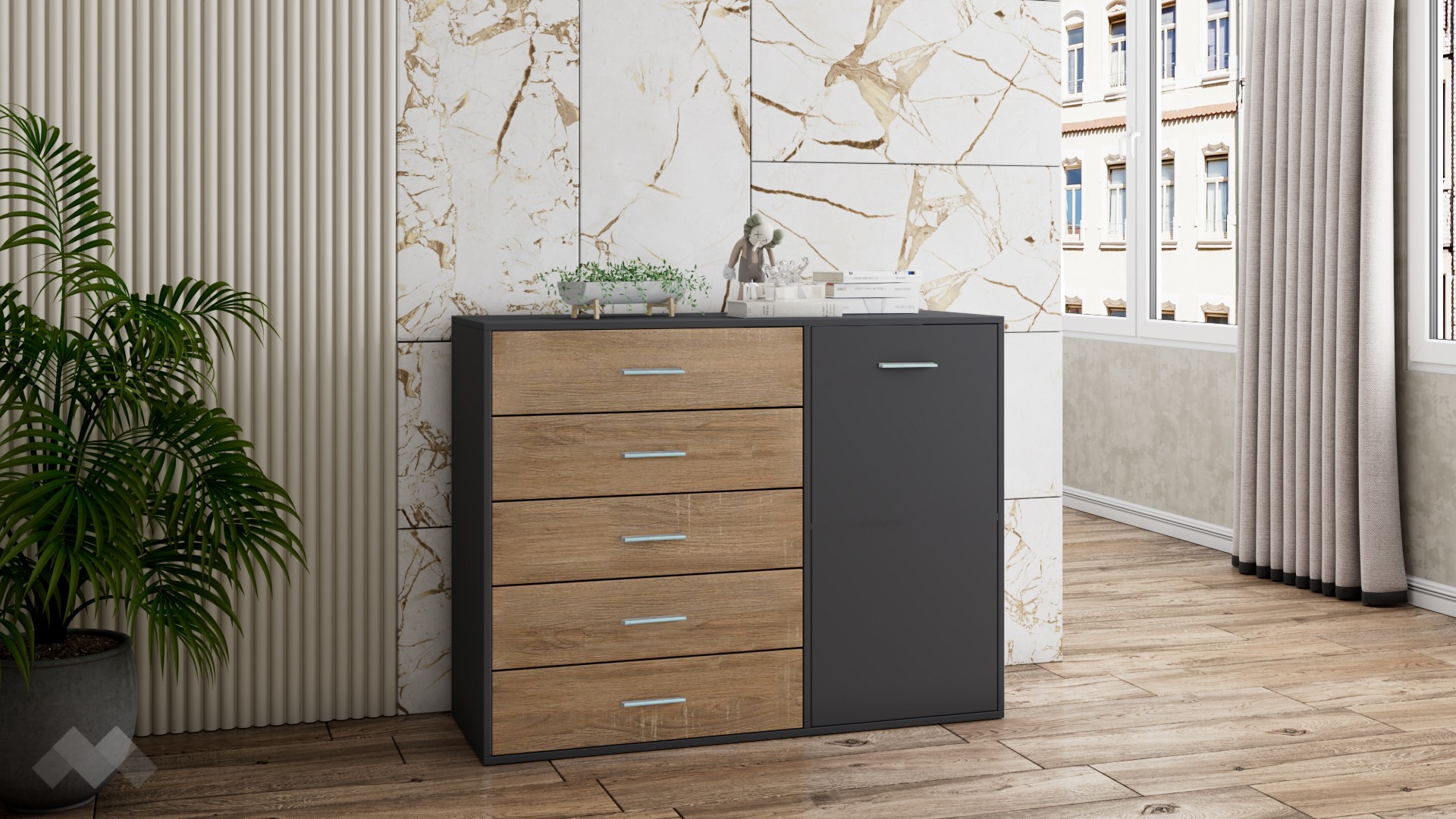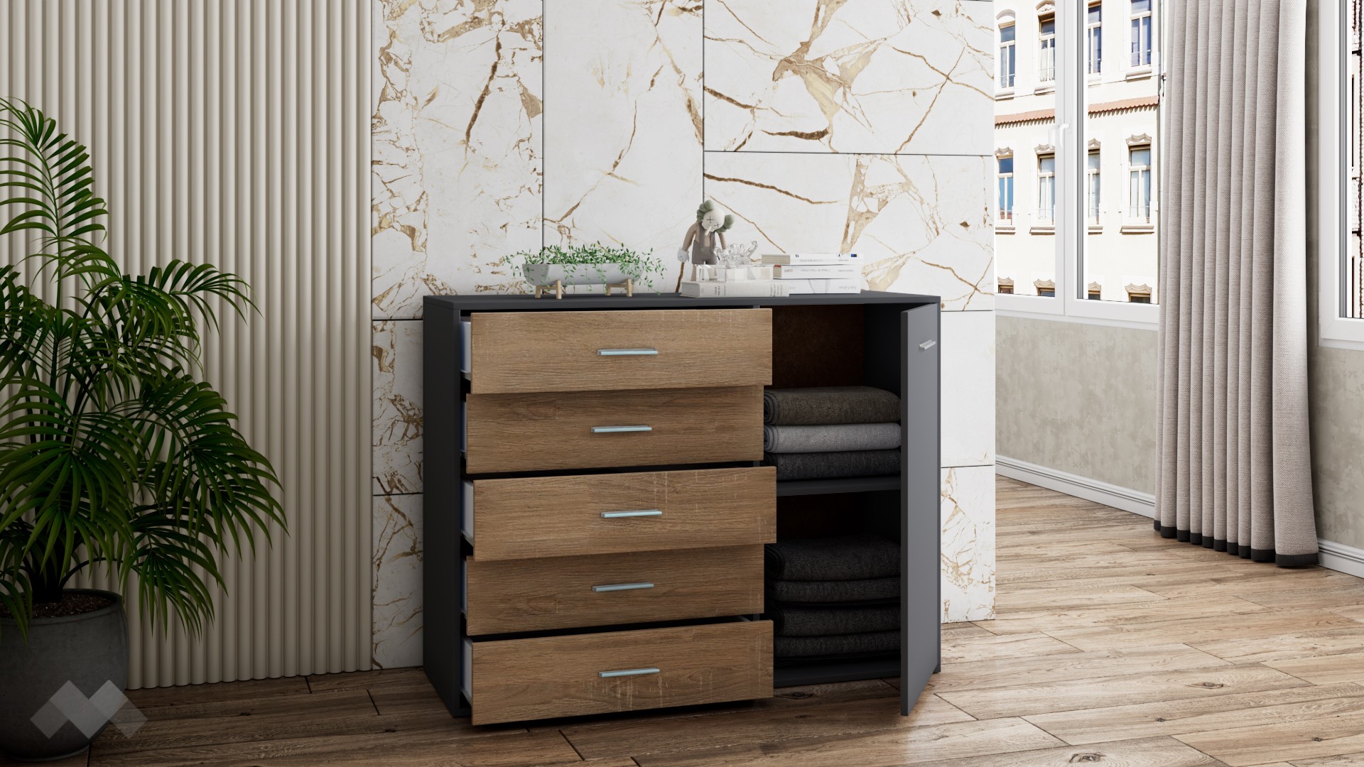 ⭐ Предимства: ✓ 5 чекмеджета ✓ затворен шкаф ✓ компактен и практичен ✓ модерен декор ✓ качествена изработка ✓ 16 мм ПДЧ