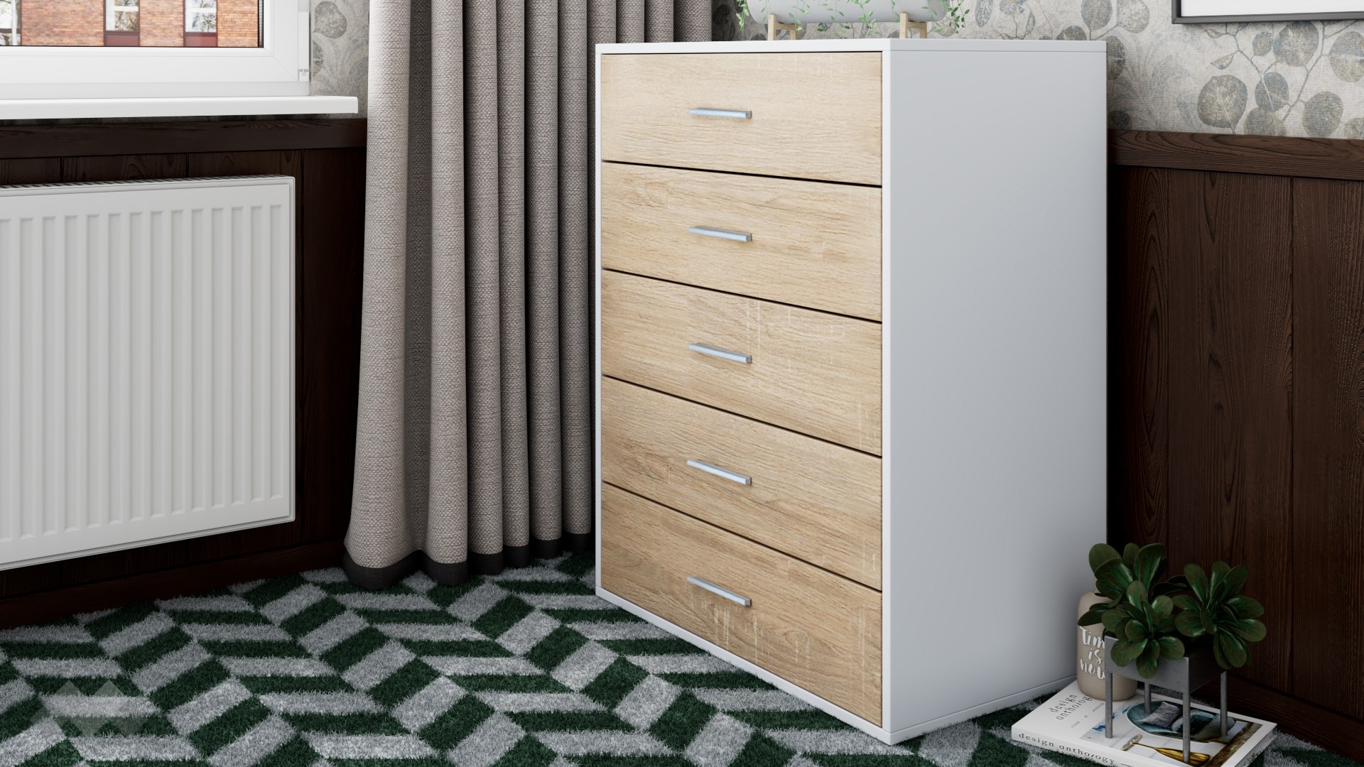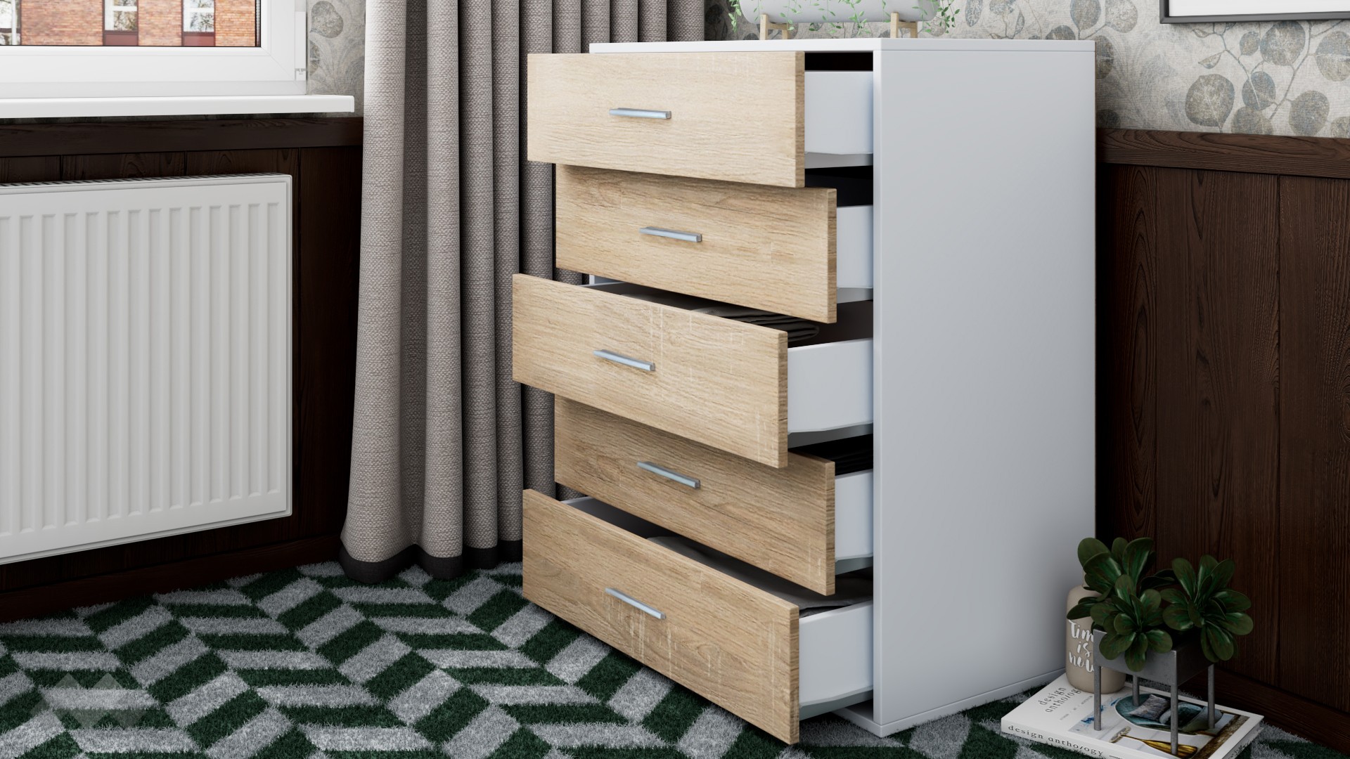 На твое разположение са пет чекмеджета, в които с лекота ще организираш голямо количество дрехи, бельо, аксесоари или други вещи. Горният плот е удобно място, където да поставиш фотографии, книги или сувенир за акцент.