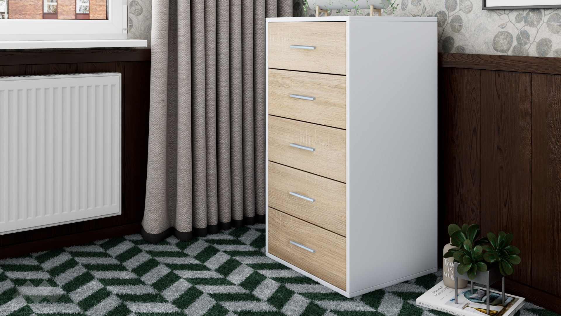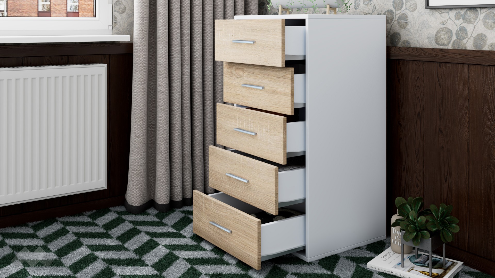 ⭐ Предимства: ✓ 5 чекмеджета ✓ компактен и практичен ✓ модерен декор ✓ качествена изработка ✓ 16 мм ПДЧ