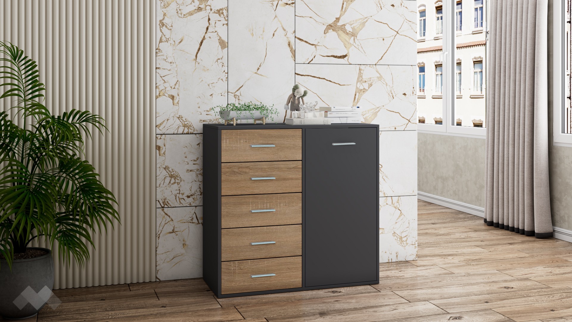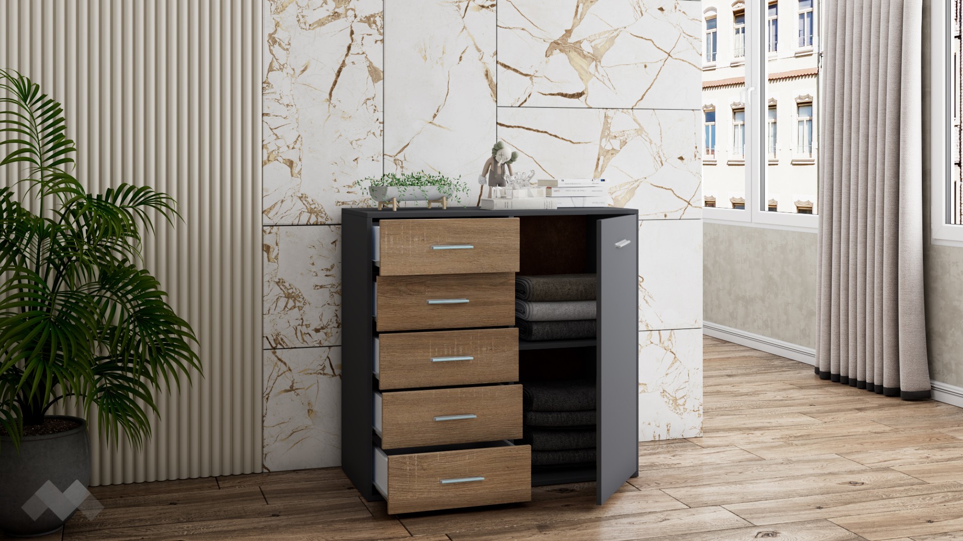 ⭐ Предимства: ✓ 5 чекмеджета ✓ затворен шкаф ✓ компактен и практичен ✓ модерен декор ✓ качествена изработка ✓ 16 мм ПДЧ