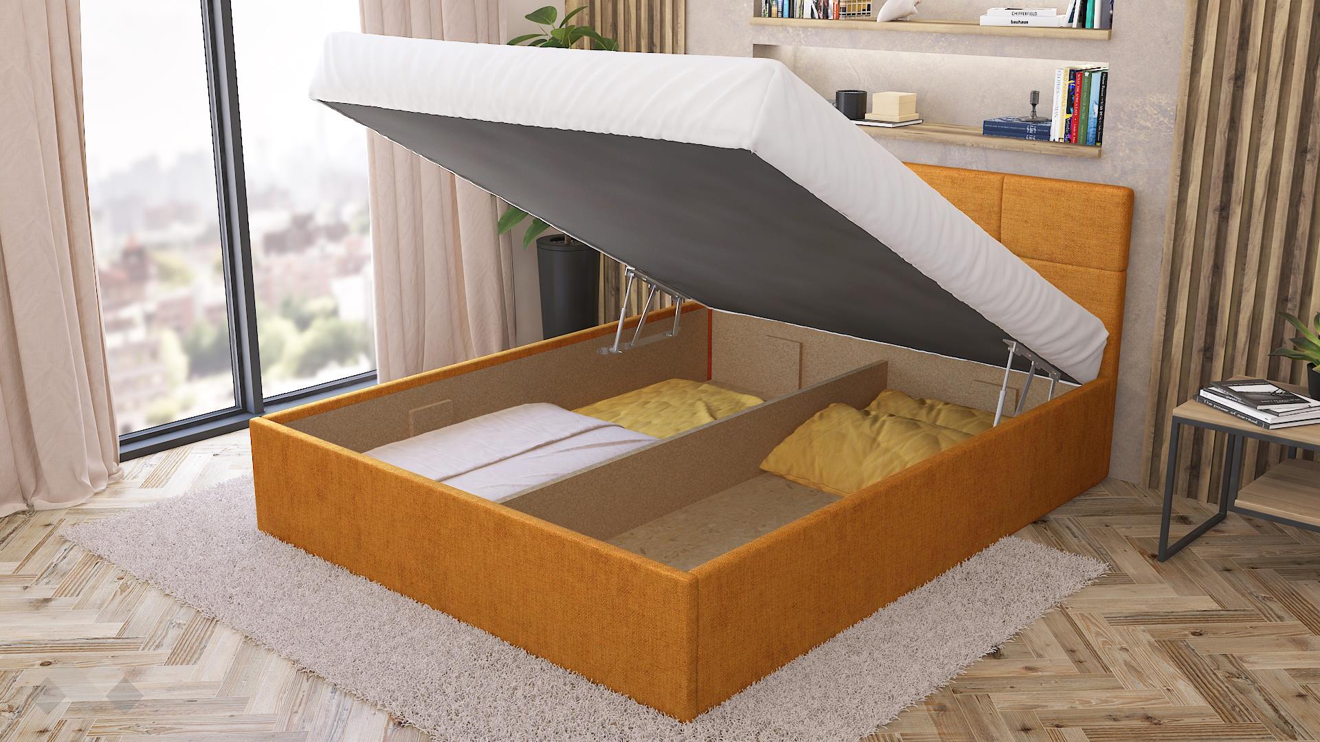 Тапицирана спалня Камил е с идеалните размери – подходяща е за матрак с размер 160/200 см. С повдигането на матрака пък се открива широко пространство, готово да побере всички възглавници и завивки, на които все не се намира място. Допълнителният делител на подматрачното пространство прави организацията на вещите още по-лесна.