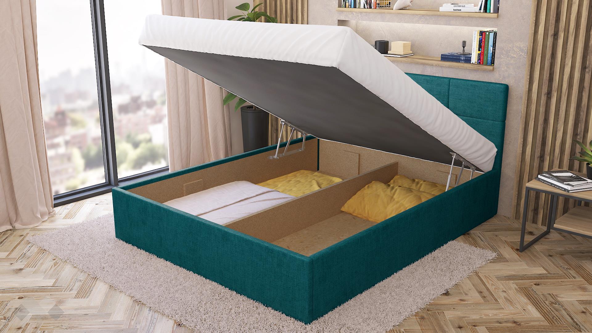 Тапицирана спалня Камил е с идеалните размери – подходяща е за матрак с размер 160/200 см. С повдигането на матрака пък се открива широко пространство, готово да побере всички възглавници и завивки, на които все не се намира място. Допълнителният делител на подматрачното пространство прави организацията на вещите още по-лесна.