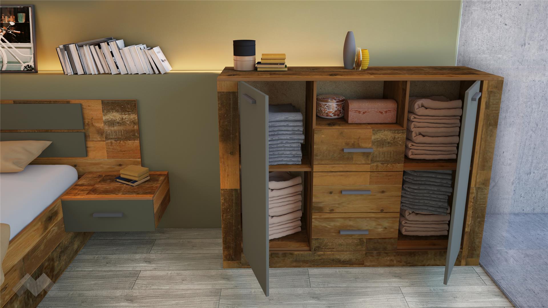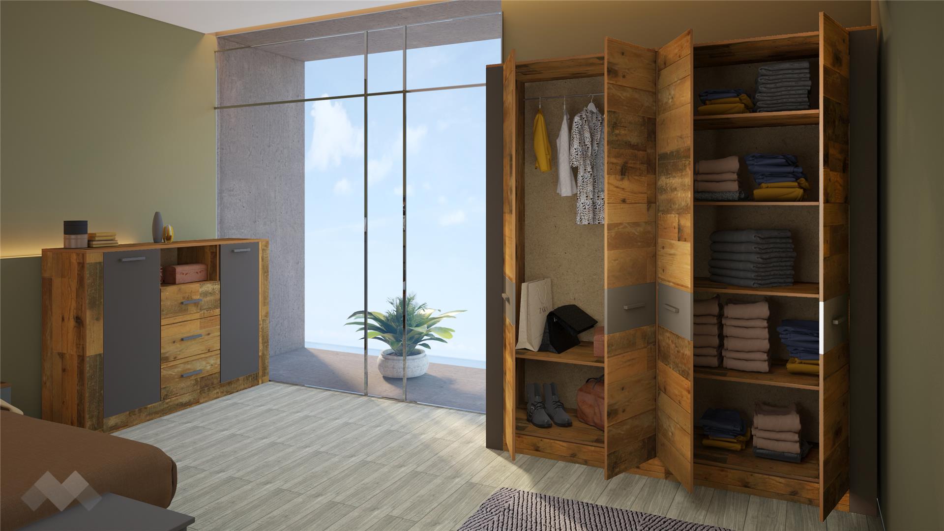 Спален комплект Камино е уникално съчетание между модерен и винтидж стил. Дървесният винтидж декор олд стайл хармонично се съчетава с модерния тъмен графит. Заедно те създават една елегантна и много свежа комбинация. Модерен щрих в дизайна придават и гланцираните в черно дръжки на всички вратички в комплекта.