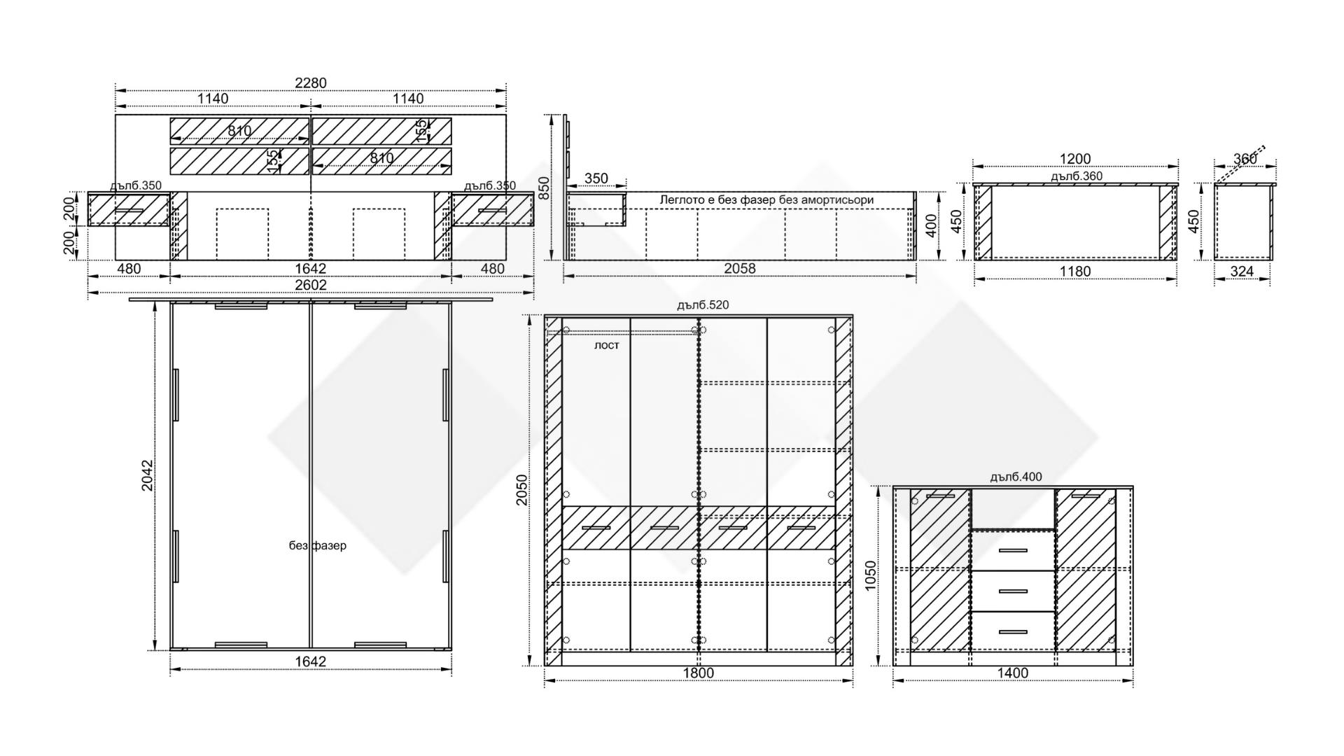 Нощен шкаф (2 бр.): Д: 48 см Ш: 35 см В: 20 см / 40 см – монтирани към спалнята