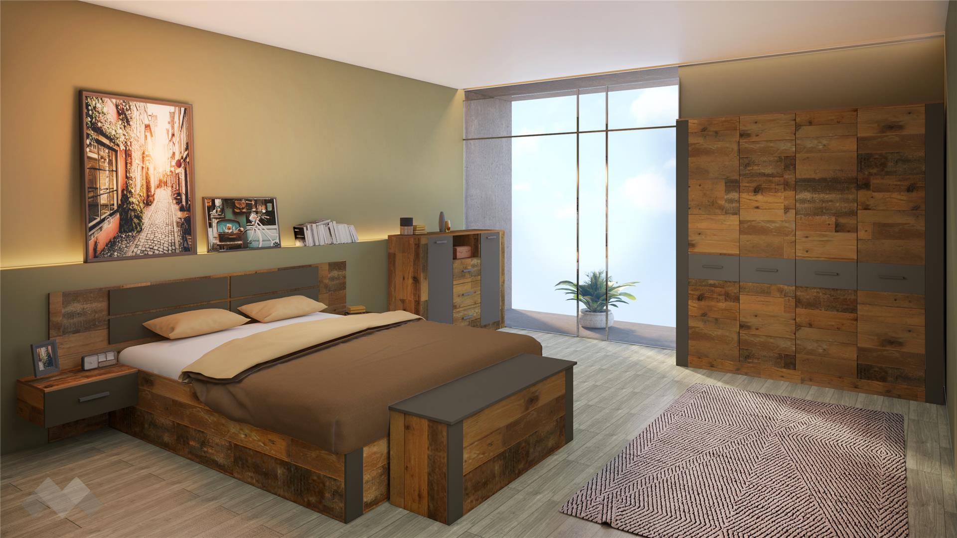 Спалнята е достатъчно голяма, за да ти предостави необходимото пространство и комфорт за сън. Таблата е ефектно декорирана с правоъгълни форми в цвят графит като акцент. Друг интересен акцент в дизайна са монтираните към спалнята нощни шкафчета, те естествено допълват нейната визия. Благодарение на свободностоящата ракла ще намериш допълнително място за одеяла и възглавници, за да са винаги под ръка, щом ти потрябват. Раклата се отваря посредством механизъм за повдигане на горния плот.