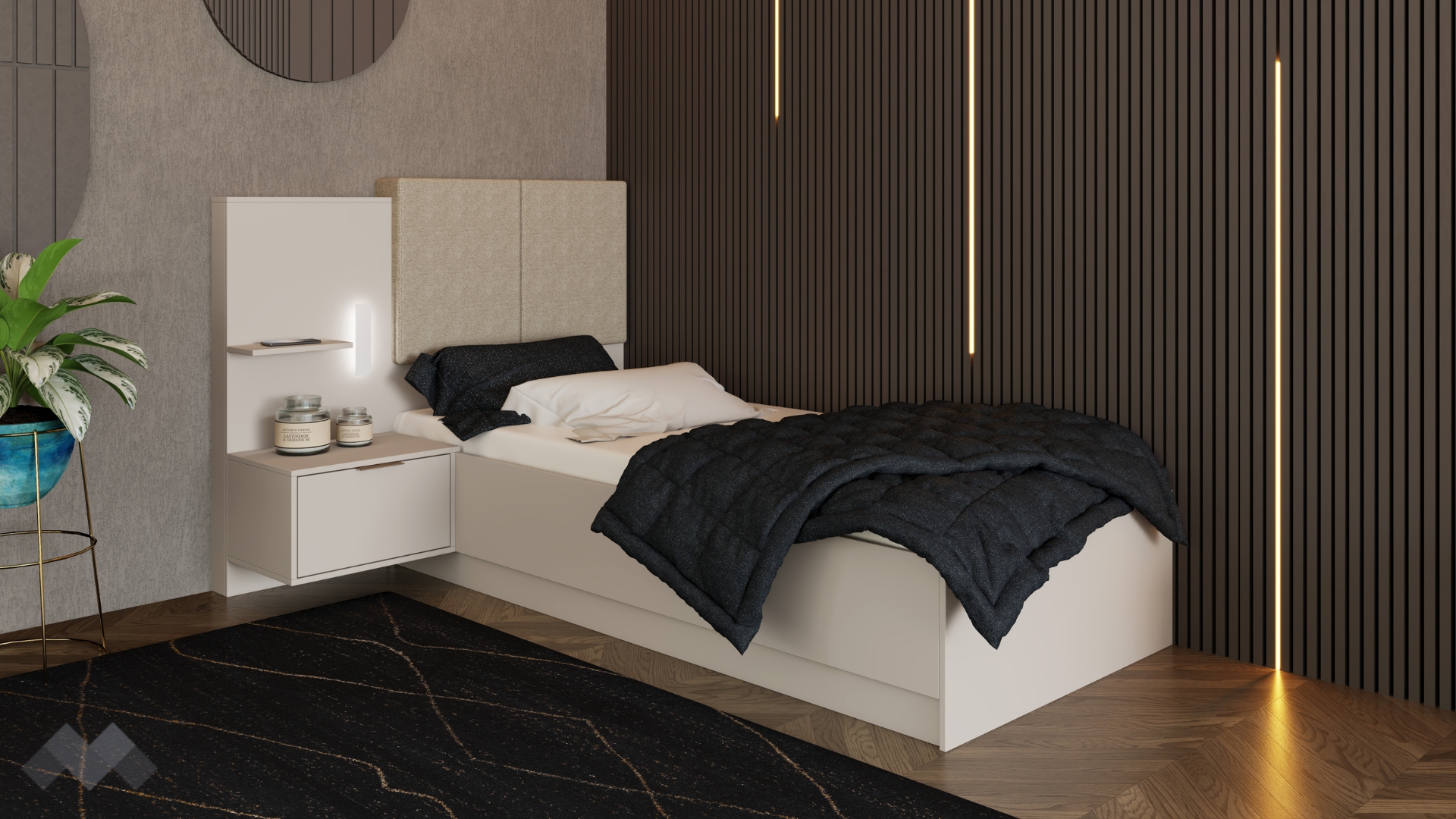 Леглото разполага с удобен рафт и чекмедже, които осигуряват място за всички дребни вещи, които искаш да ти бъдат под ръка – телефон, книга, очила, козметика или ароматни свещи. Чекмеджето е снабдено със сачмени водачи с пълно изтегляне, които осигуряват пълен достъп до съдържанието и гарантират дълготрайна устойчивост.