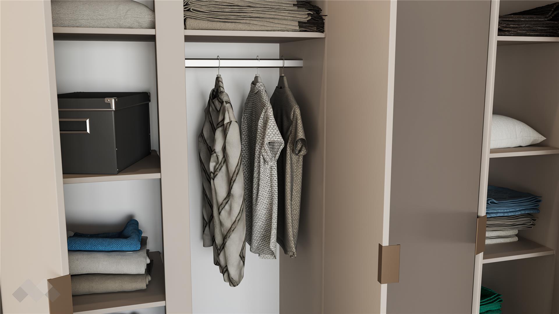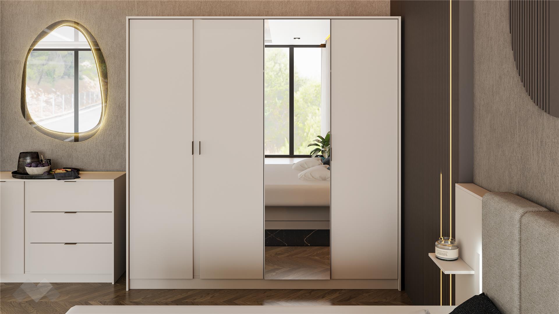 Четирикрилният гардероб е проектиран с мисъл за максимално удобство и практичност. Разположеното огледало на вратата не само добавя функционалност, но и визуално разширява пространството. Просторните рафтове и лостът за закачалки осигуряват перфектната организация на дрехите. Със своето елегантно излъчване и фини детайли, този гардероб е не само практичен, но и стилен елемент, който добавя завършеност на твоята спалня.