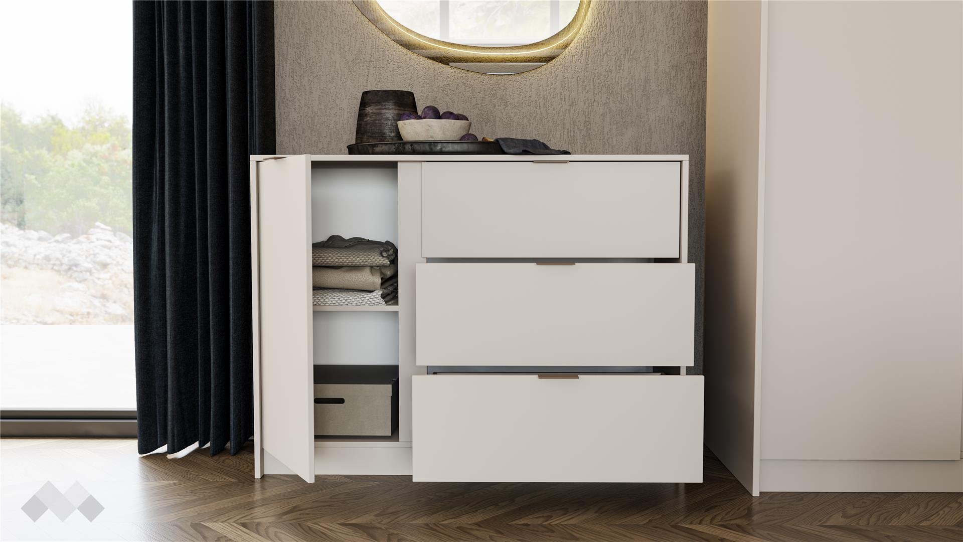 Скринът с три чекмеджета и един шкаф допълва комплекта и предоставя достатъчно място за съхранение на лични вещи, козметика и други. Чекмеджетата са снабдени със сачмени водачи с пълно изтегляне, които осигуряват пълен достъп до съдържанието и гарантират дълготрайна устойчивост.