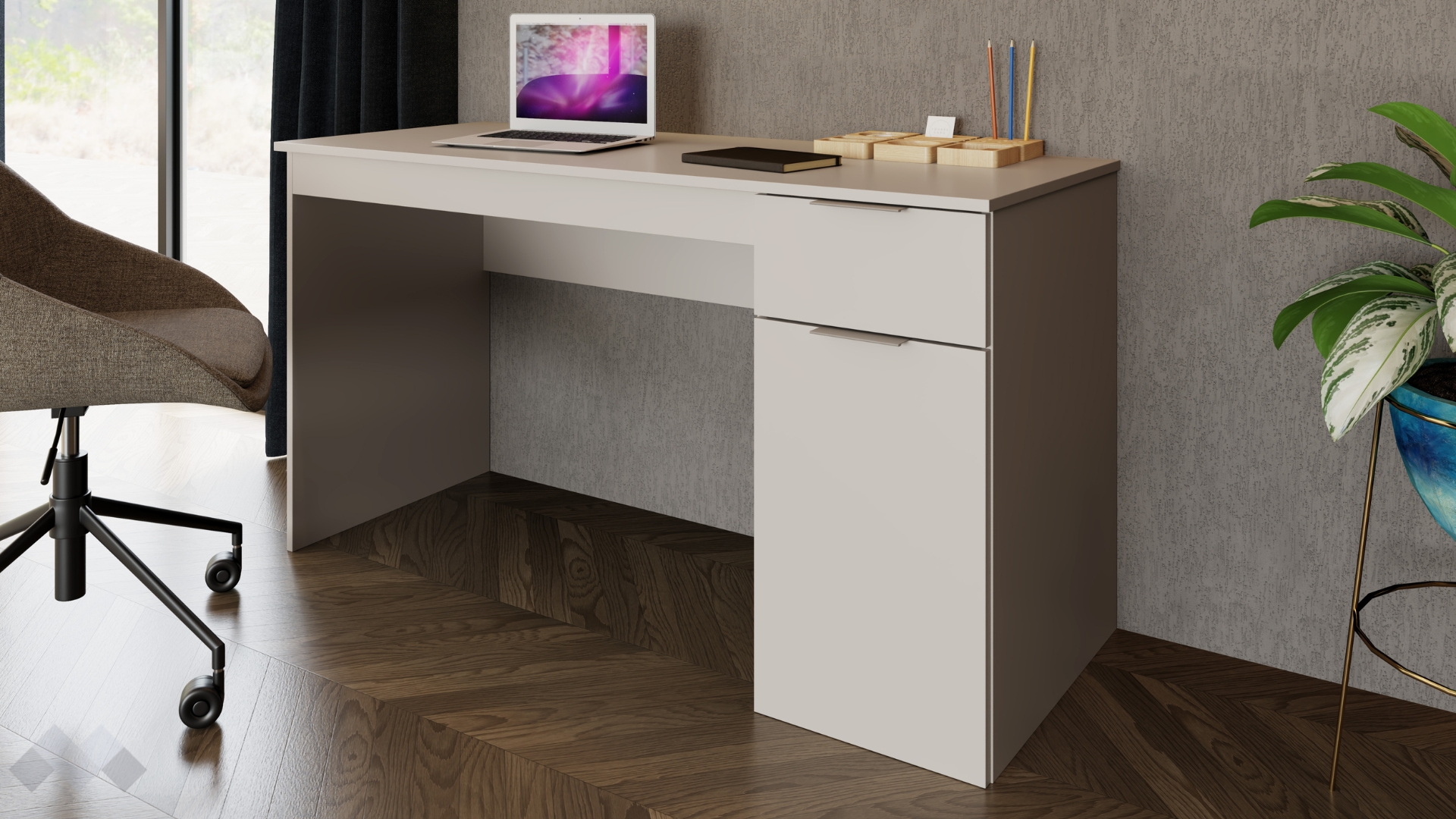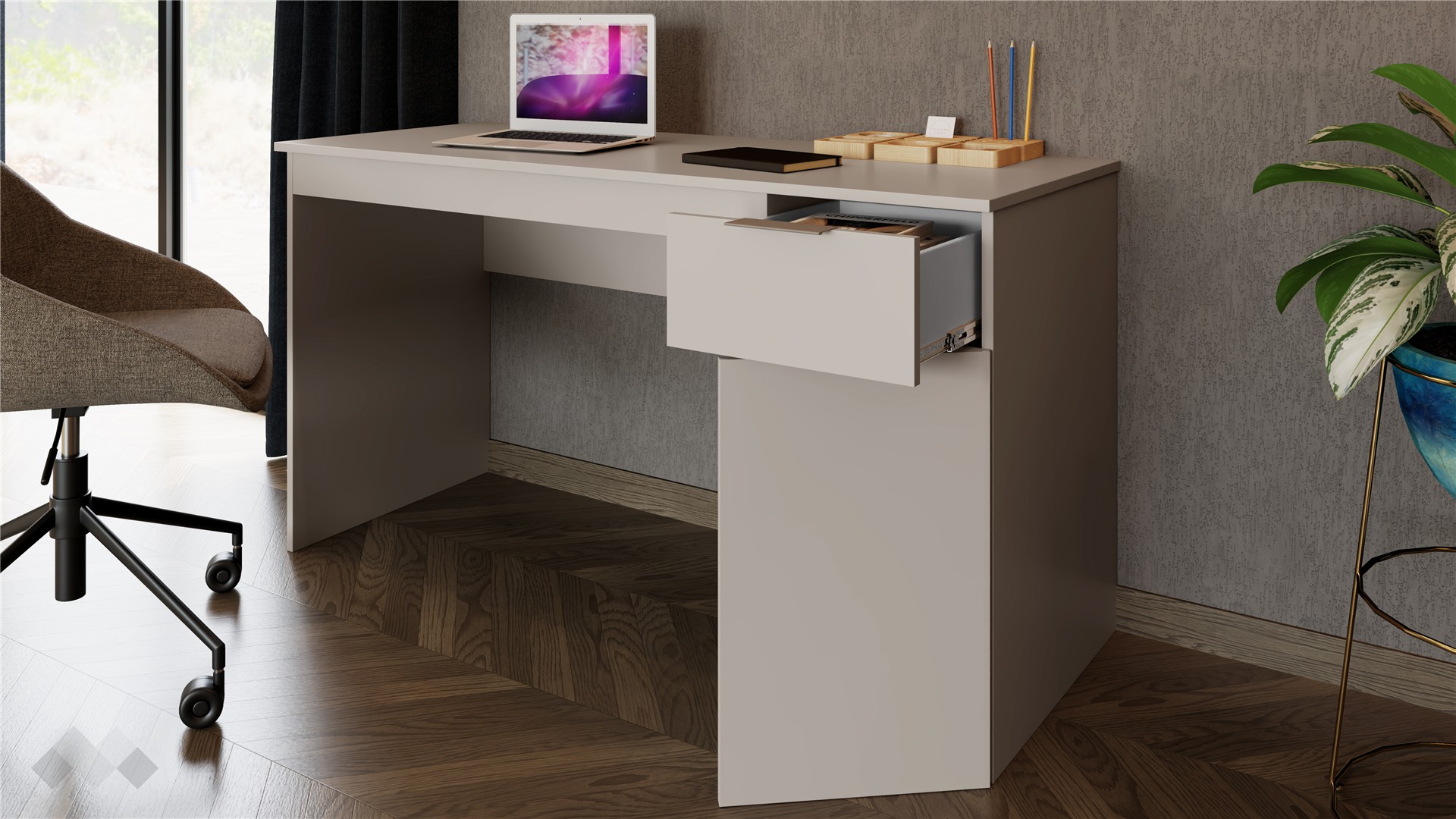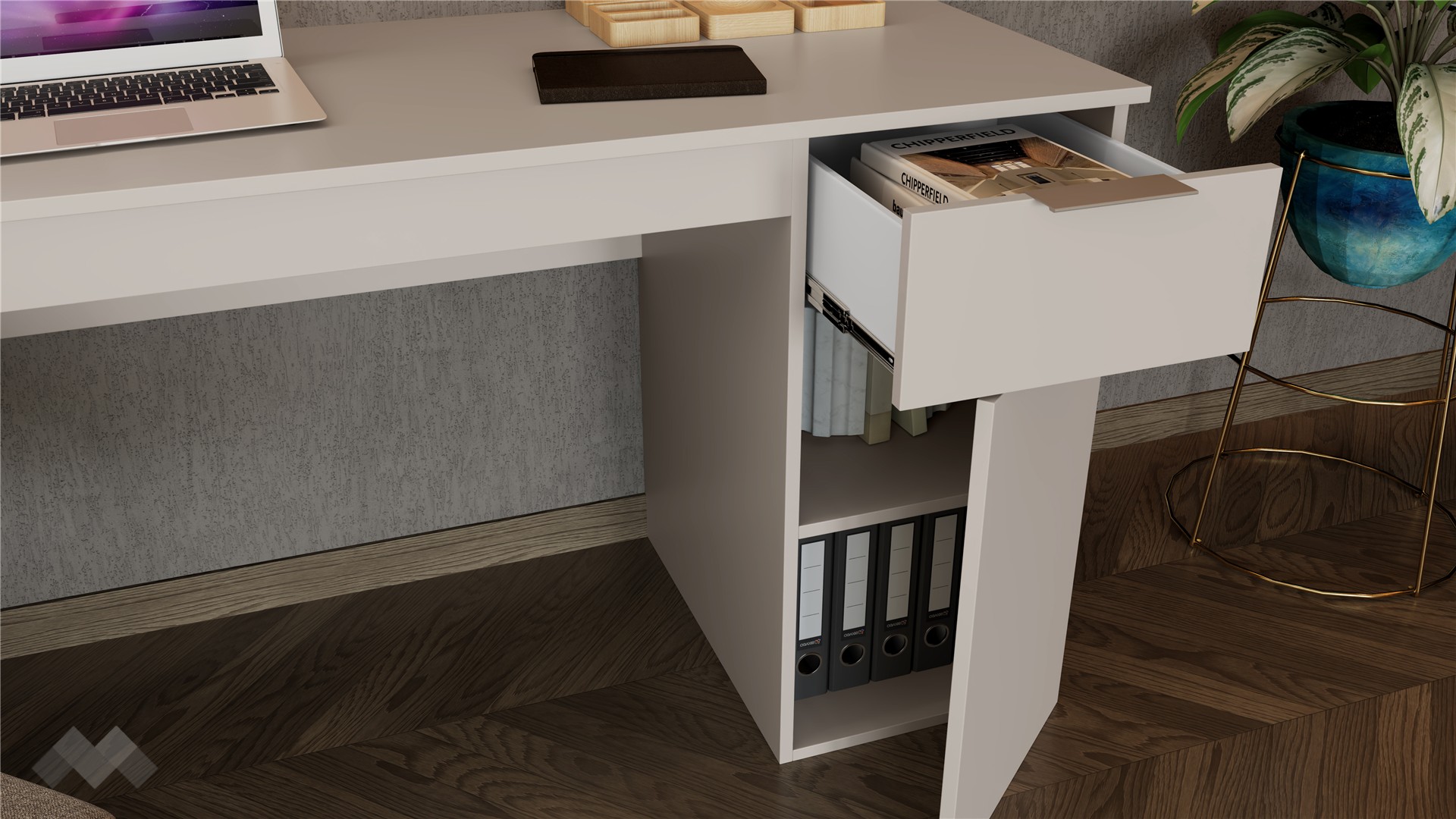 Под работния плот е разположено удобно чекмедже, в което можеш да поставиш най-необходимите документи или други вещи, а под него има затворен шкаф с рафт, подходящ за организиране на необходимите в работата инструменти и канцеларски материали. Чекмеджето е снабдено със сачмени водачи с пълно изтегляне, които осигуряват пълен достъп до съдържанието и гарантират дълготрайна устойчивост.