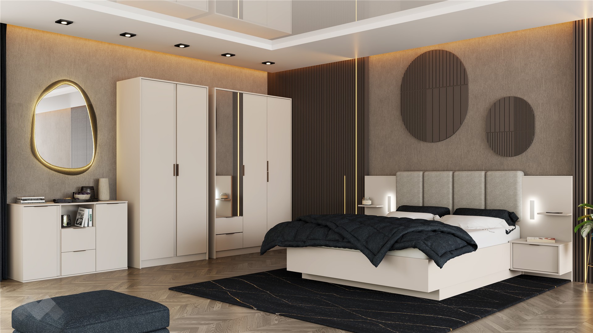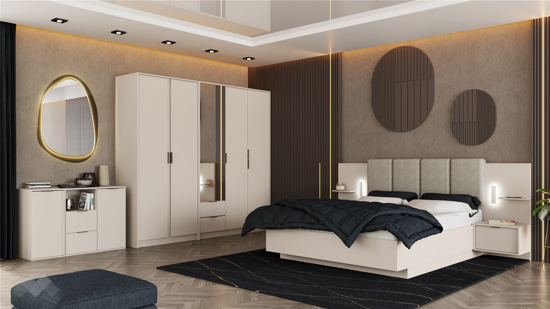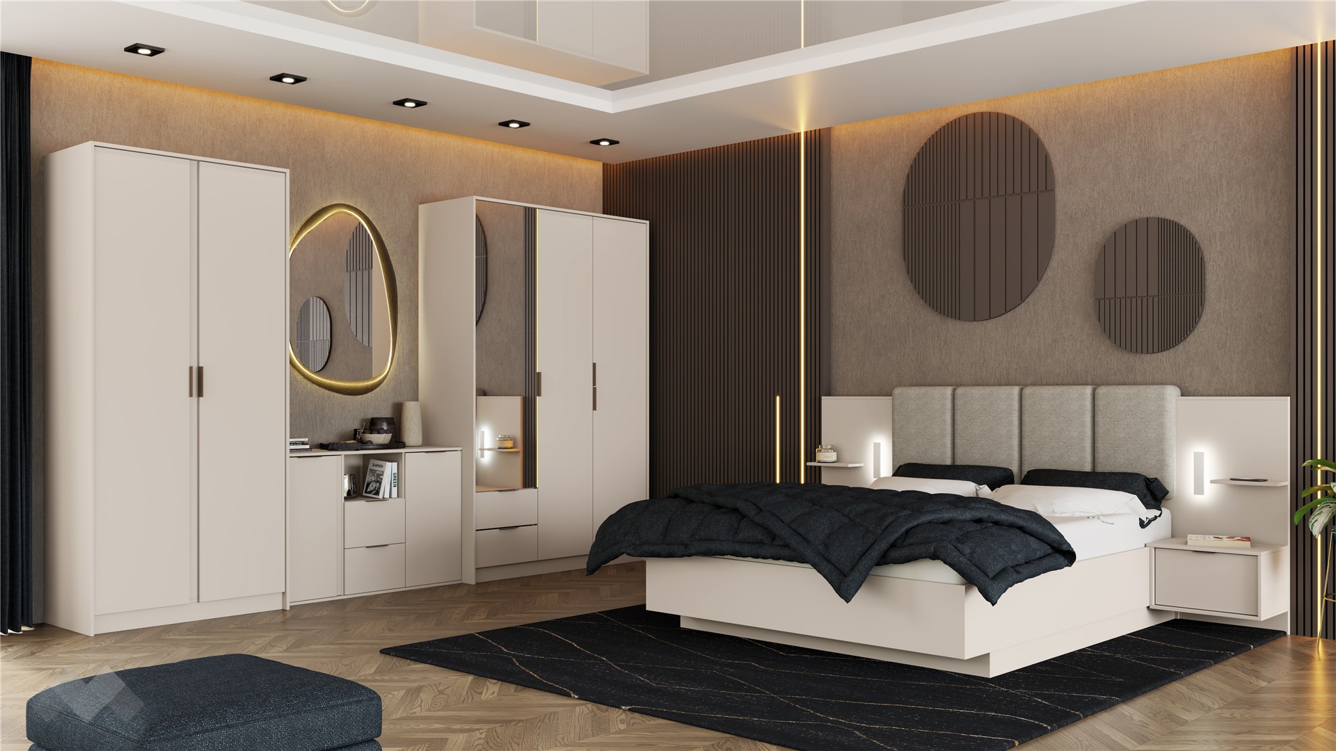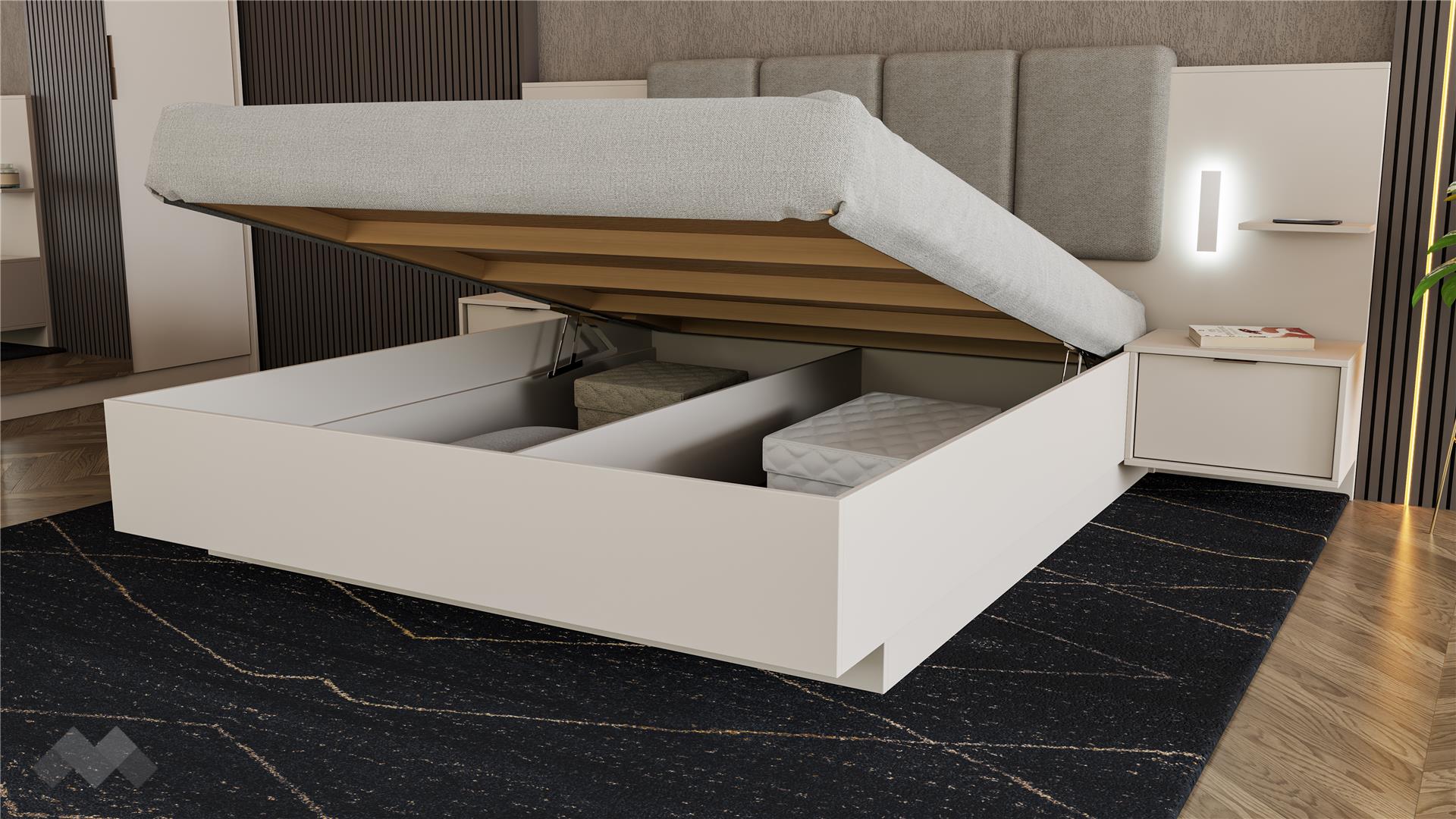 Спалнята е подходяща за матрак 160/200 см. Тапицираната табла носи усещане за лукс и комфорт, като осигурява удобна опора при четене, почивка или гледане на телевизия. Вграденото LED осветление е не само стилно, но и функционално, като елиминира нуждата от допълнителни нощни лампи. Включеният повдигащ мехнизъм позволява лесен достъп до пространството под матрака, предоставяйки възможност за съхранение на вещи и багаж, което е особено полезно в малки пространства.