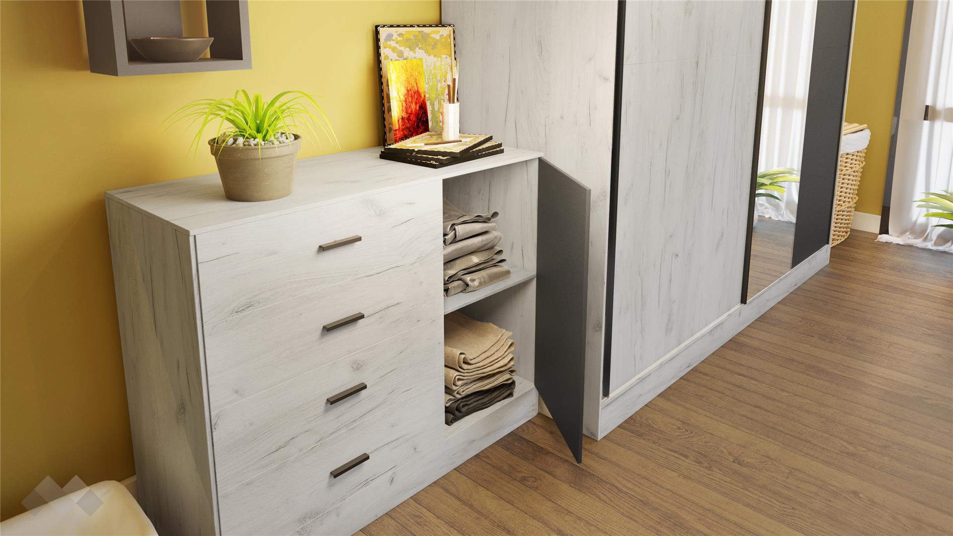 Спалният комплект включва още едно красиво допълнение – елегантен скрин с четири чекмеджета и шкаф, завършени с дръжки. Спален комплект Кели е изработен от качествено 16 мм ПДЧ, отличаващо се с висока здравина и дълъг живот.