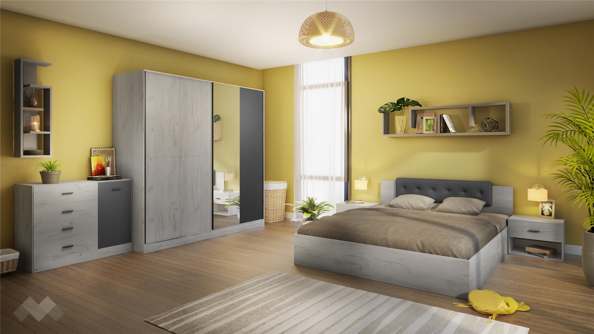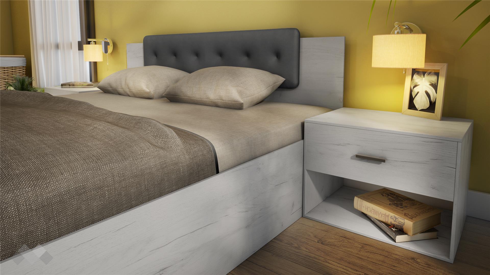 Спалнята е голяма и удобна, а таблата ѝ е тапицирана с еко кожа Soft – мекотата при облягане е осезаема. Комплектът е допълнен от две стилни нощни шкафчета с по едно чекмедже, идеални за нощни лампи, декорации или просто книгата, която четеш.