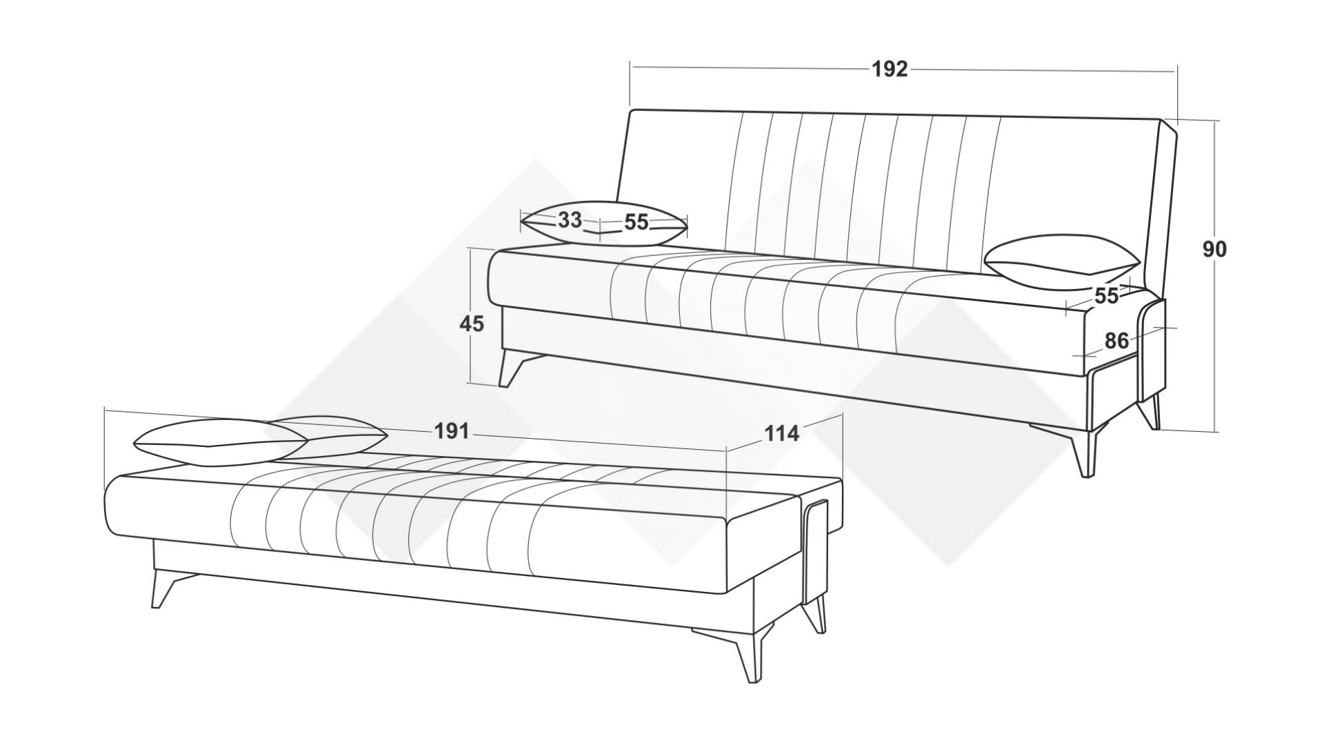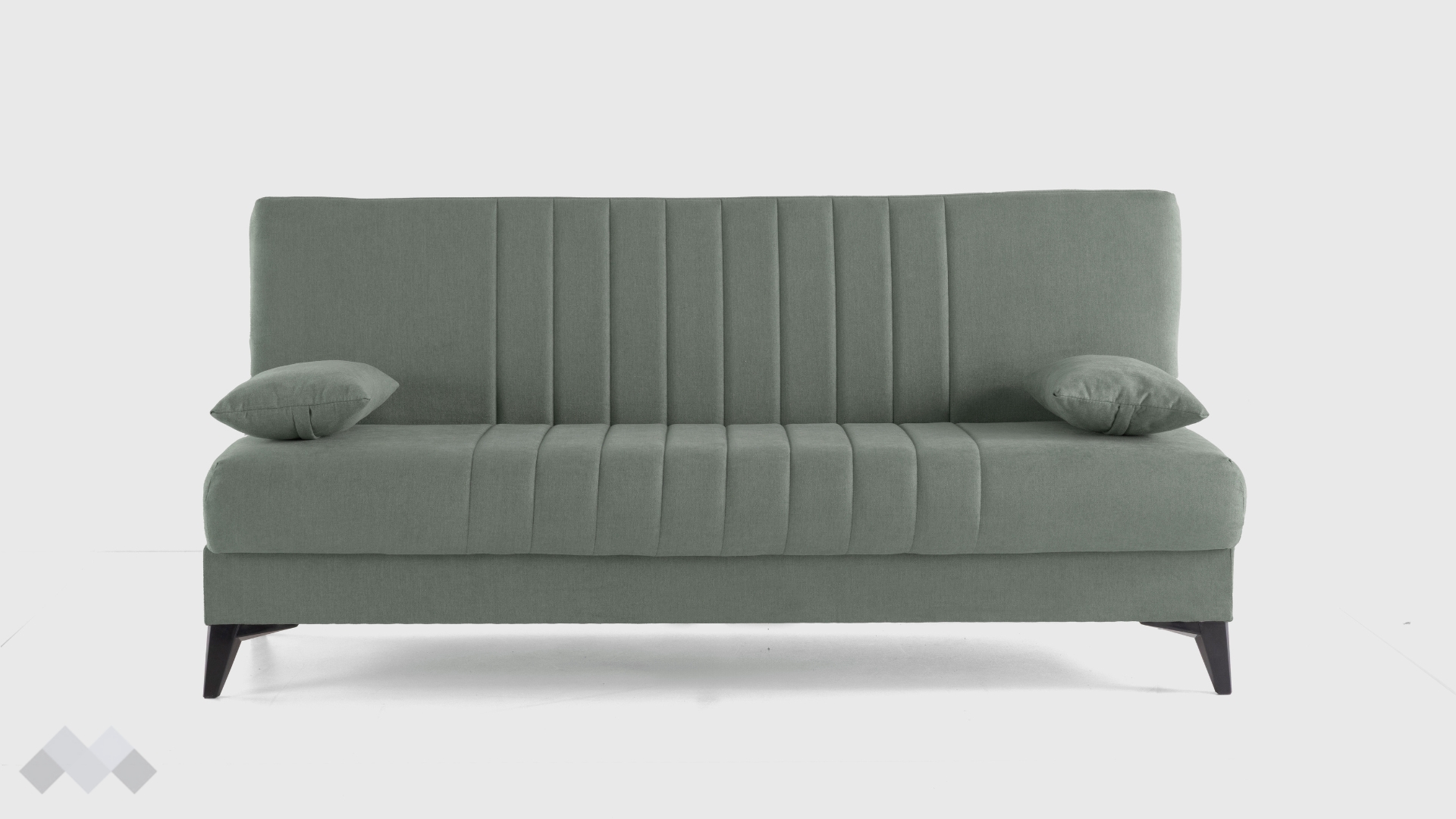 Подлакътниците са оформени с възглавници, които лесно се отстраняват при нужда, за да разширят използваемата площ. Това прави канапето още по-функционално и удобно при посрещане на гости или при необходимост от кратка почивка през деня. Просторната ракла под седалката осигурява допълнително място за съхранение на спално бельо, завивки и други вещи.