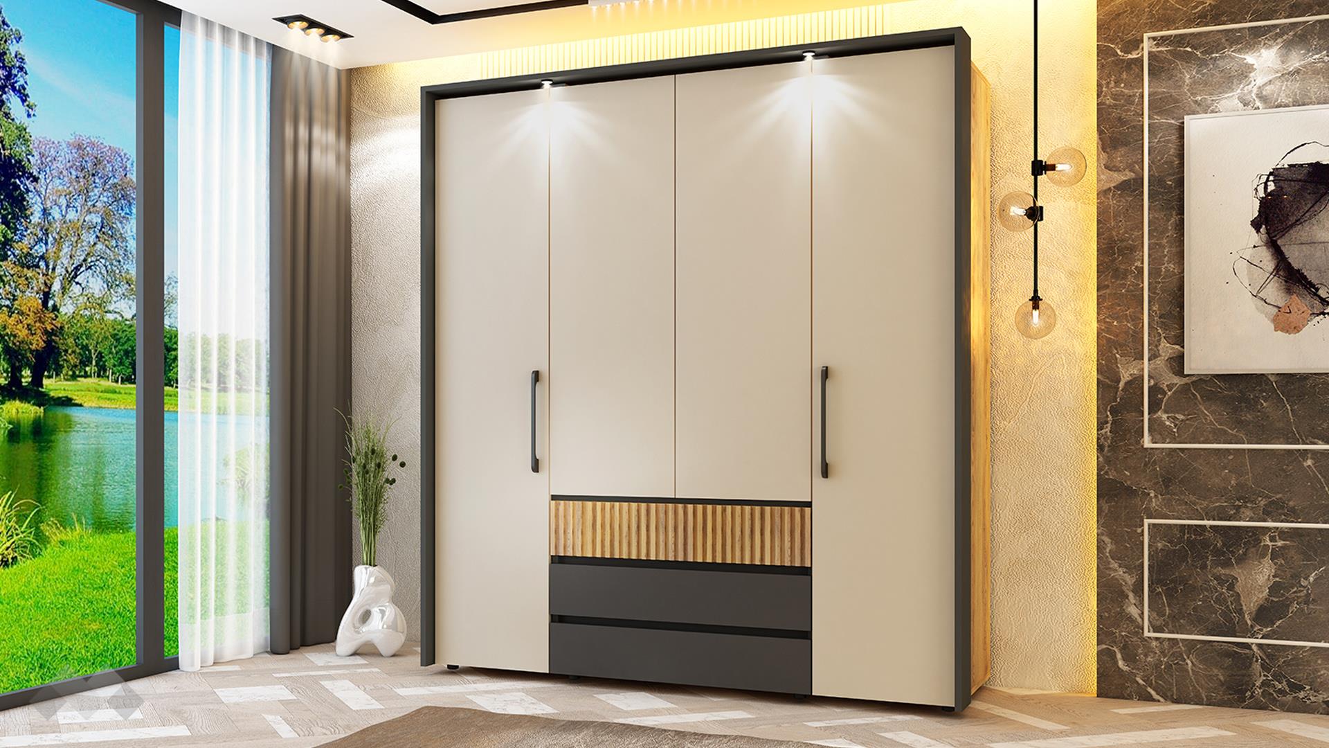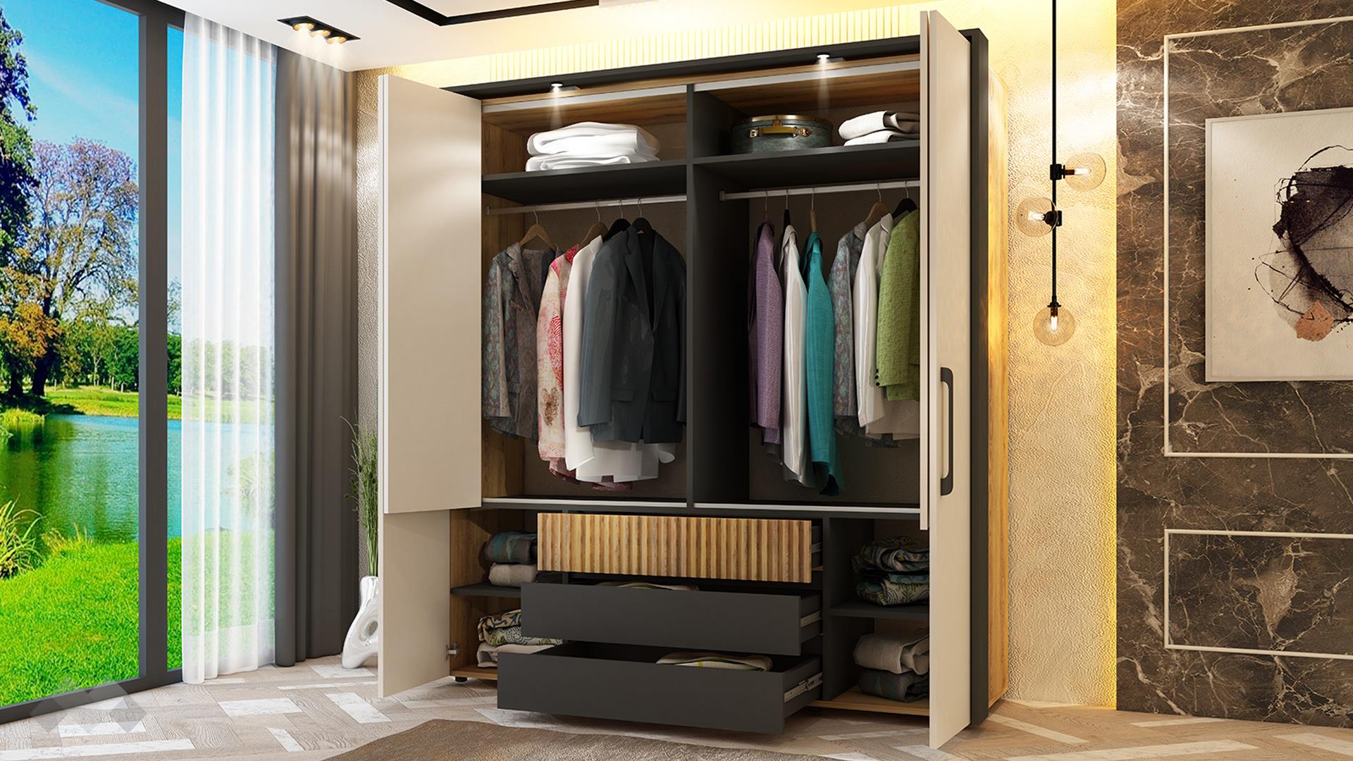 Четирикрилен гардероб, със средна част витрина и три чекмеджета , създава вертикален ритъм и добавя дълбочина към визията на пространството. Вътрешното разпределение е функционално - от ляво разполага с три рафта, по средата зад врата над чекмеджетата има лост за закачалки и LED  осветление, а в дясно има два лоста за закачалки на две нива.
