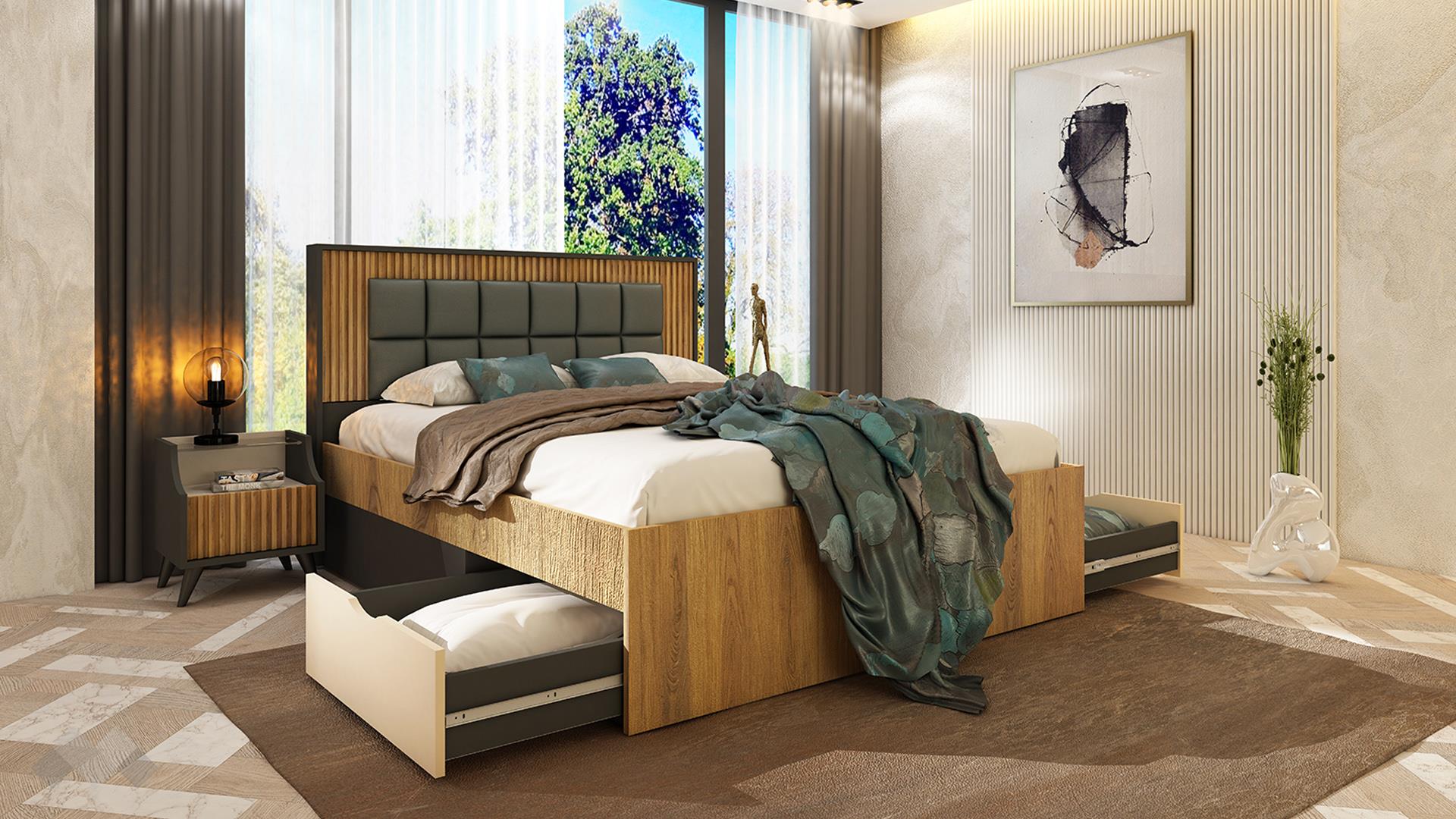 Нощните шкафчета са с минималистичен дизайн – с открит рафт и чекмедже, а изчистения корпус в денвър финиш и графитени акценти следват стилистиката на леглото.