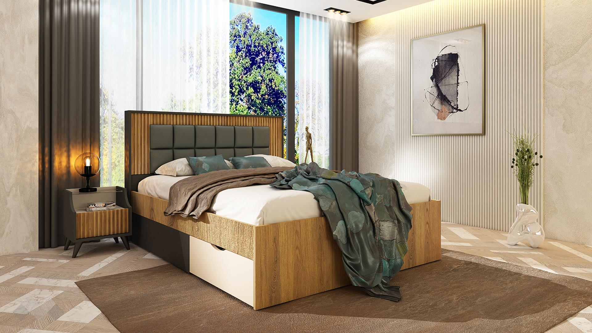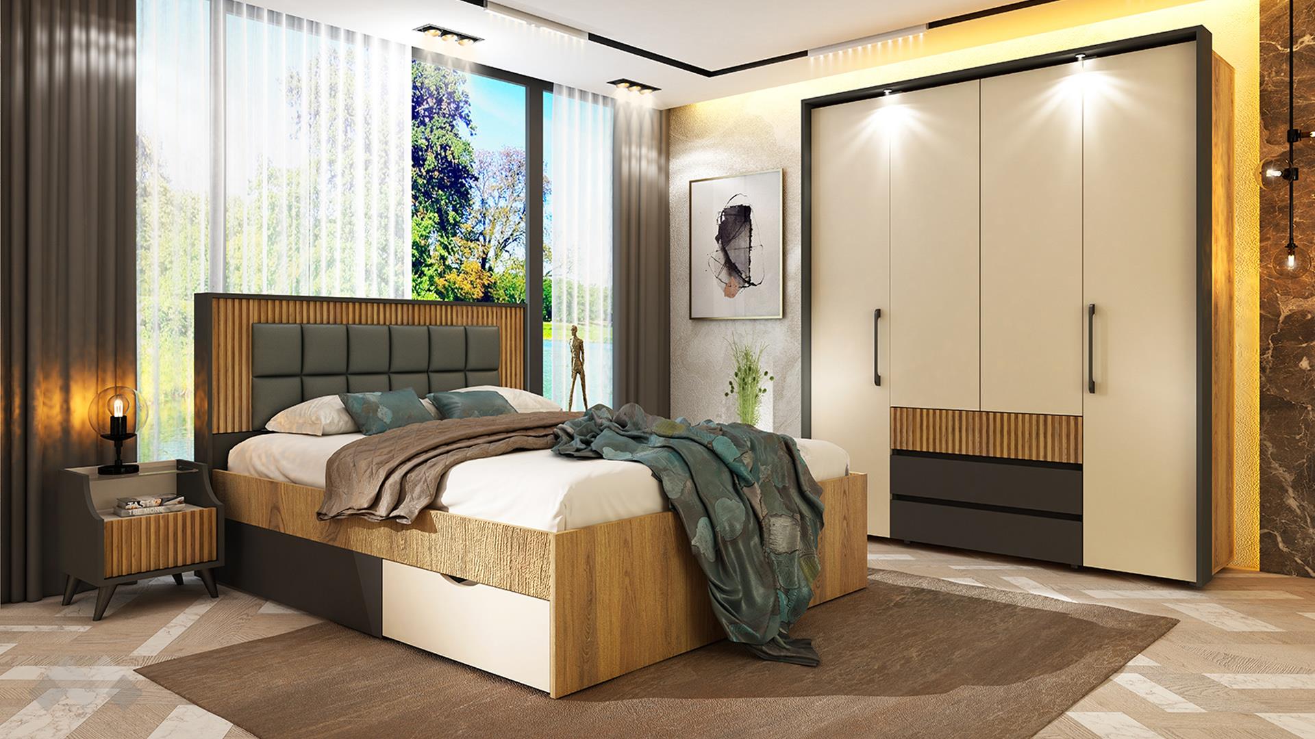 Основен елемент в обзавеждането е спалнята с висока тапицирана табла, подходяща за матрак 160/200. Таблата разполага с LED осветление - служи за нощна лампа и спестява място на плота на нощните шкафчета.Таблата е текстилно облечена в неутрален бежов тон, контрастиращ с рамка в денвърдекор и графитен кант, което допринася за баланса между топлина и модерен характер.