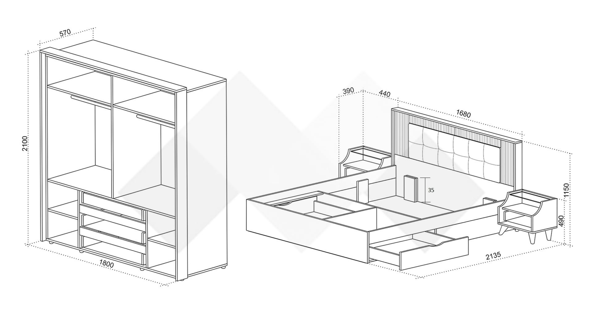 Този изискан спален комплект се отличава с модерна линия, естествени дървесни текстури и внимателно подбрани акценти, които създават уютна, но съвременна атмосфера. Съчетава в себе си функционалност, елегантност и оригинален интериорен почерк.