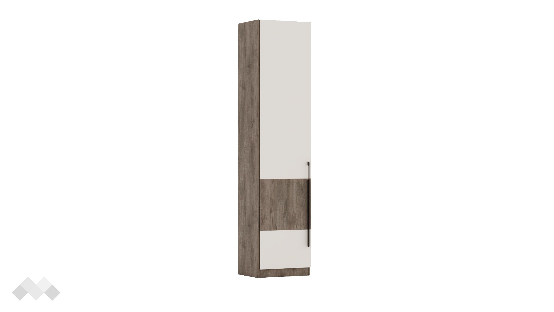 Двукрилният гардероб разполага с два рафта и лост за закачалки, а еднокрилният скосен гардероб е с четири рафта, което ще ти позволи да подредиш добре всичките си дрехи и аксесоари. А любимите си книги, скъпи спомени като сувенири и фотографии, декорации или вещи, които искаш да ти бъдат винаги под ръка, можеш да подредиш върху петте открити рафта на високия шкаф етажерка.
