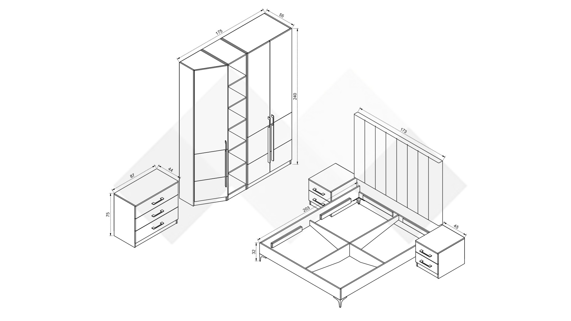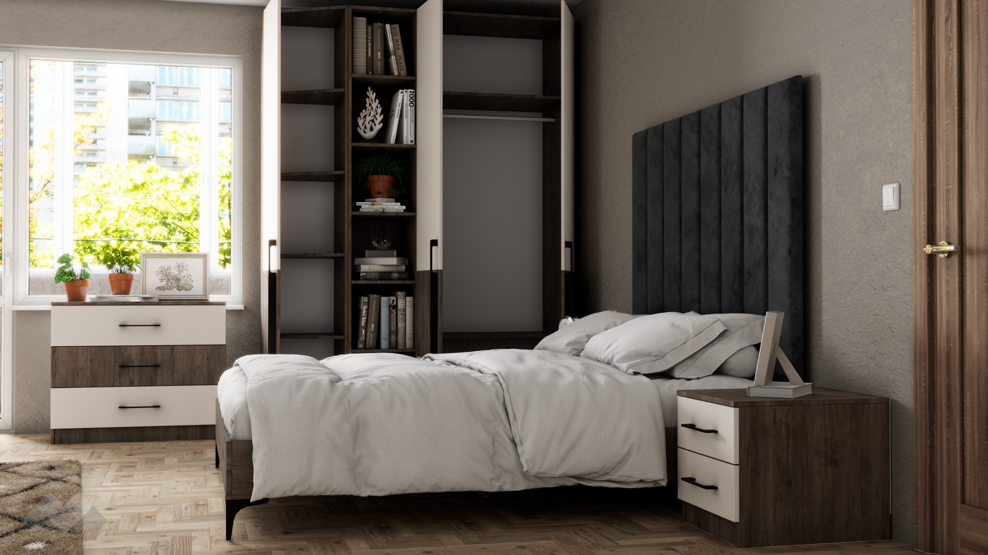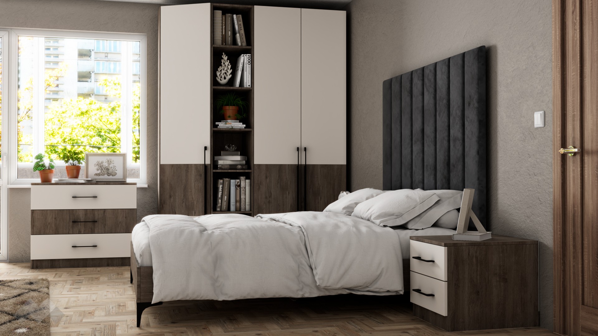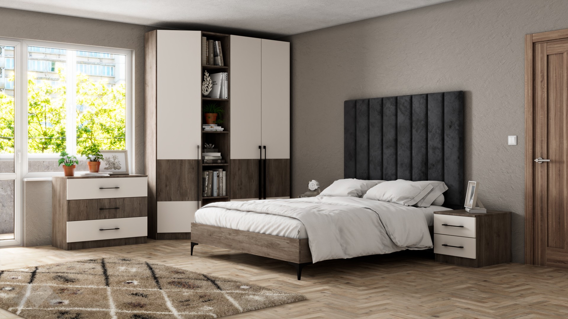 ⭐ Предимства: ✓ 18 мм ПДЧ ✓ спалня за матрак 160/200 ✓ тапицирана табла ✓ гардеробна система ✓ механизъм за плавно затваряне ✓ скрин с 3 чекмеджета ✓ две нощни шкафчета ✓ модерен и функционален дизайн