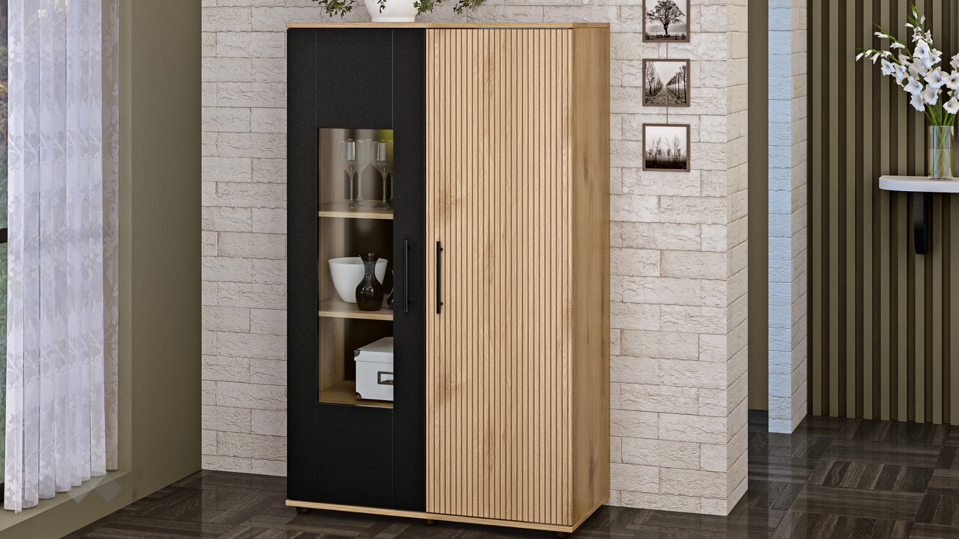 Левият модул на двукрилния шкаф е със стъклена врата, зад която са разположени четири рафта, идеални за излагане на декоративни елементи, сервизи или напитки. Десният модул е с плътна врата зад която ще откриеш три рафта, осигуряващи място за книги или други вещи, които искате да съхранявате прибрани.