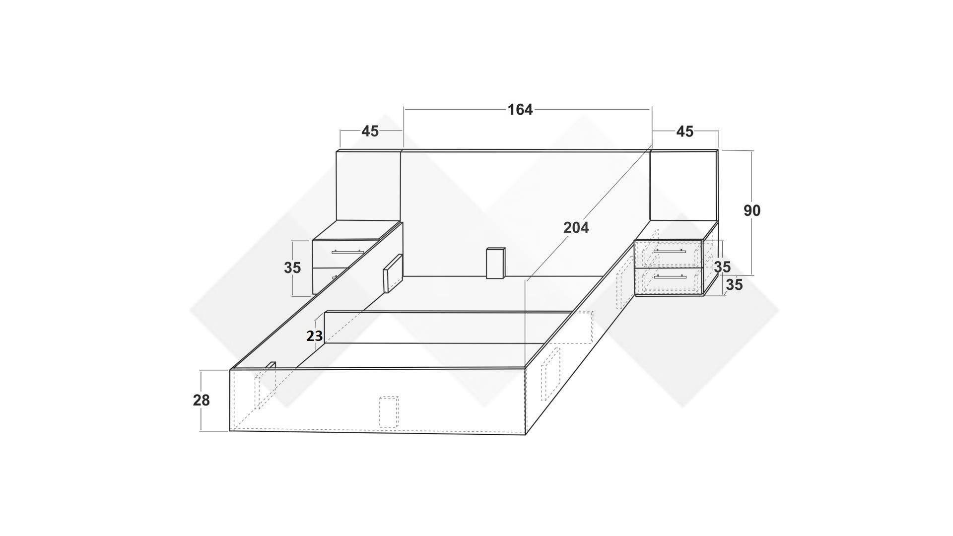 Леглото е с изчистени линии и стабилна основа, подходящо за матрак с размери 160/200 см. В комплекта са включени две нощни шкафчета, които предлагат удобно място за съхранение на лични вещи, книги, очила или други нужни аксесоари до леглото. Плотовете им позволяват поставяне на лампи, декорации или техника за удобство при ползване.