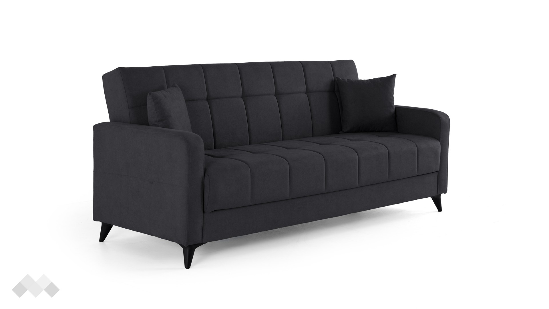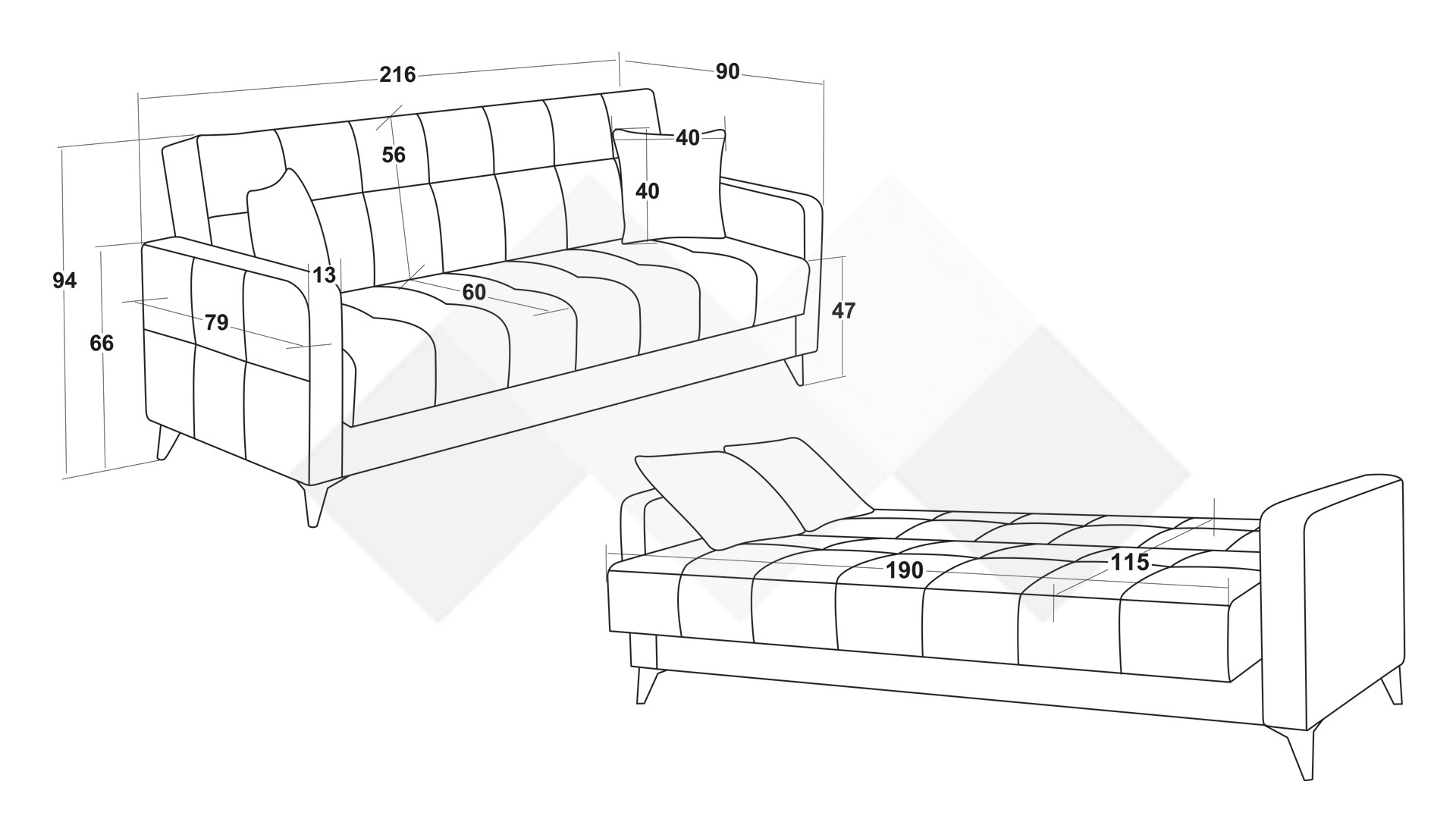 Клик-клак механизмът позволява лесна и бърза трансформация от диван в легло с размер за сън 190/115 см. Това го прави отличен избор както за ежедневна почивка, така и за неочаквани гости. Вградената ракла под седалната част осигурява практично пространство за съхранение на завивки, възглавници и други необходими вещи, така че домът ти винаги да изглежда подреден. Дамаската е устойчива, приятна на допир и подходяща за интензивна употреба.