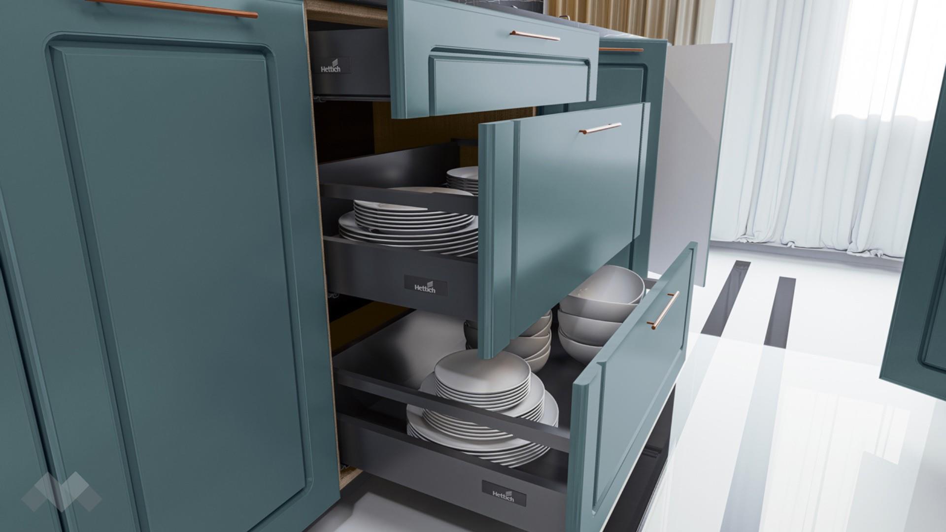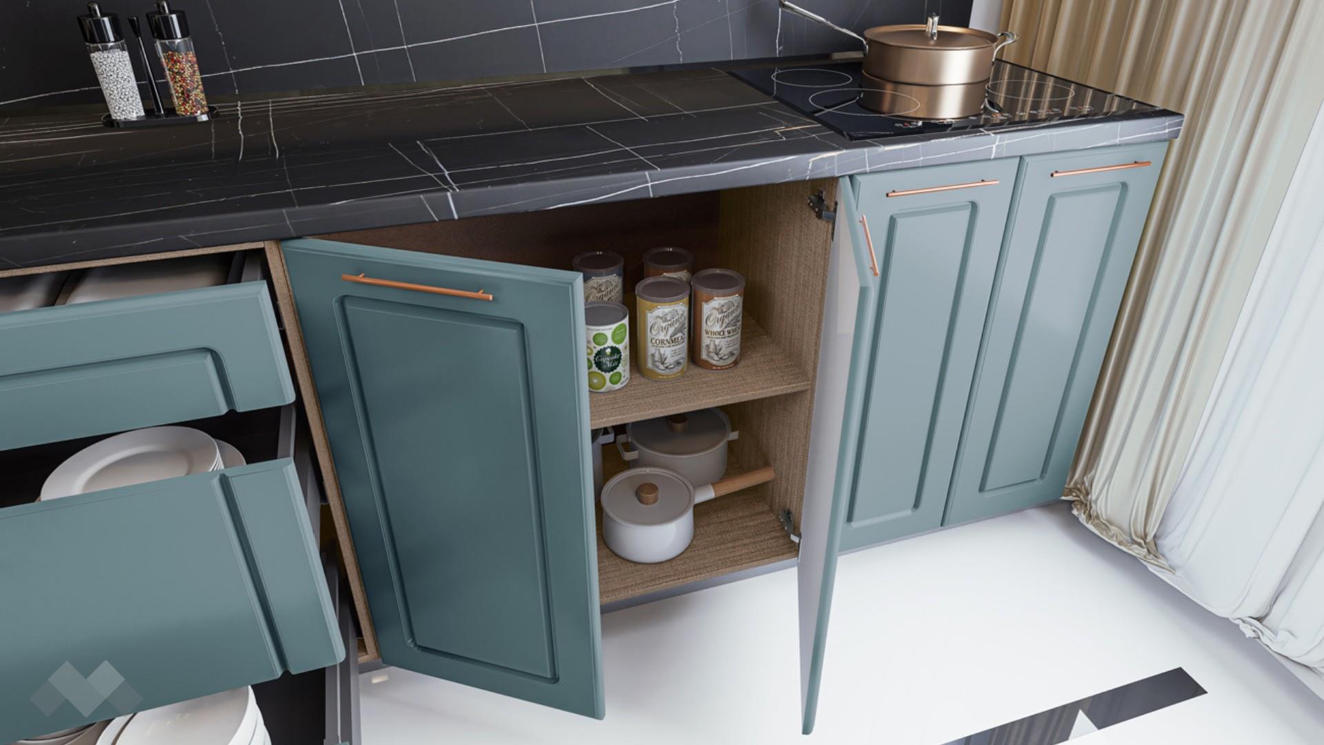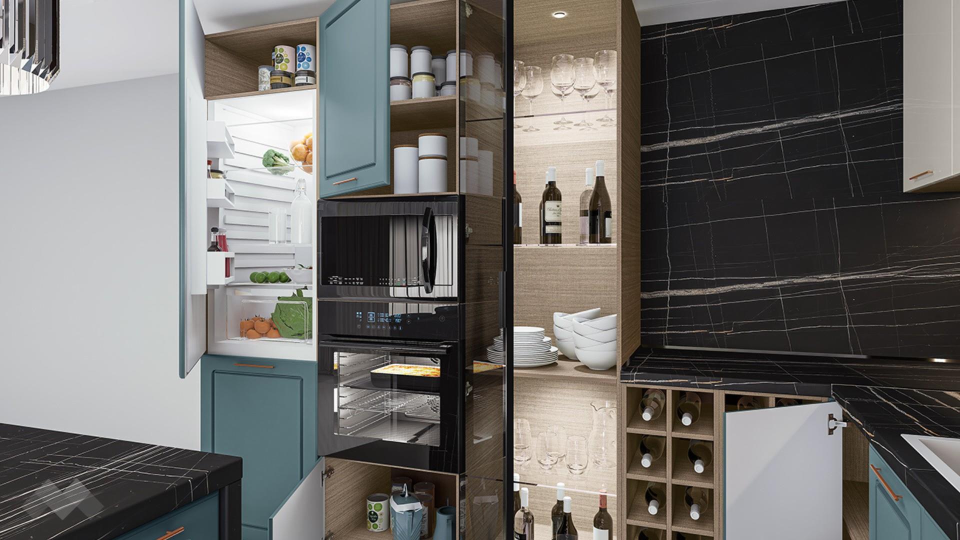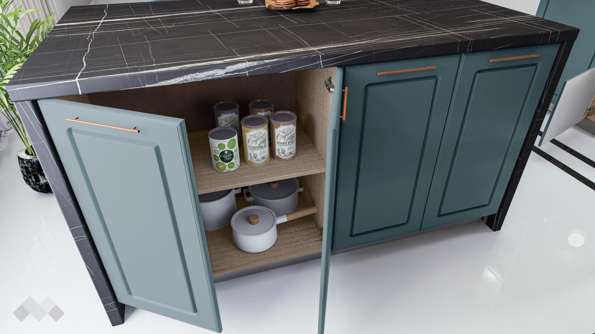 Горния ред шкафове са достатъчно на брой и големина, че да поберат както малко използваните уреди, така и тези, които използваш всчки ден. Шкаф стандартен размер за вграждане на хладилник - за да бъде всичко в синхрон. Шкаф за вграждане на фурна и микровълнова. Долния ред шкафове е функционално подбран - перфектната комбинация на рафтове и чекмеджета, за да поберат често използваните уреди, подправки и посуда. Витринния шкаф е с опушени матови стъкла 4 мм., 4 рафта и LED осветление, за да изглежда още по-елегантно. Островът - допълнително място за съхранение, още площ за работа и място за сладки приказки и хапване.