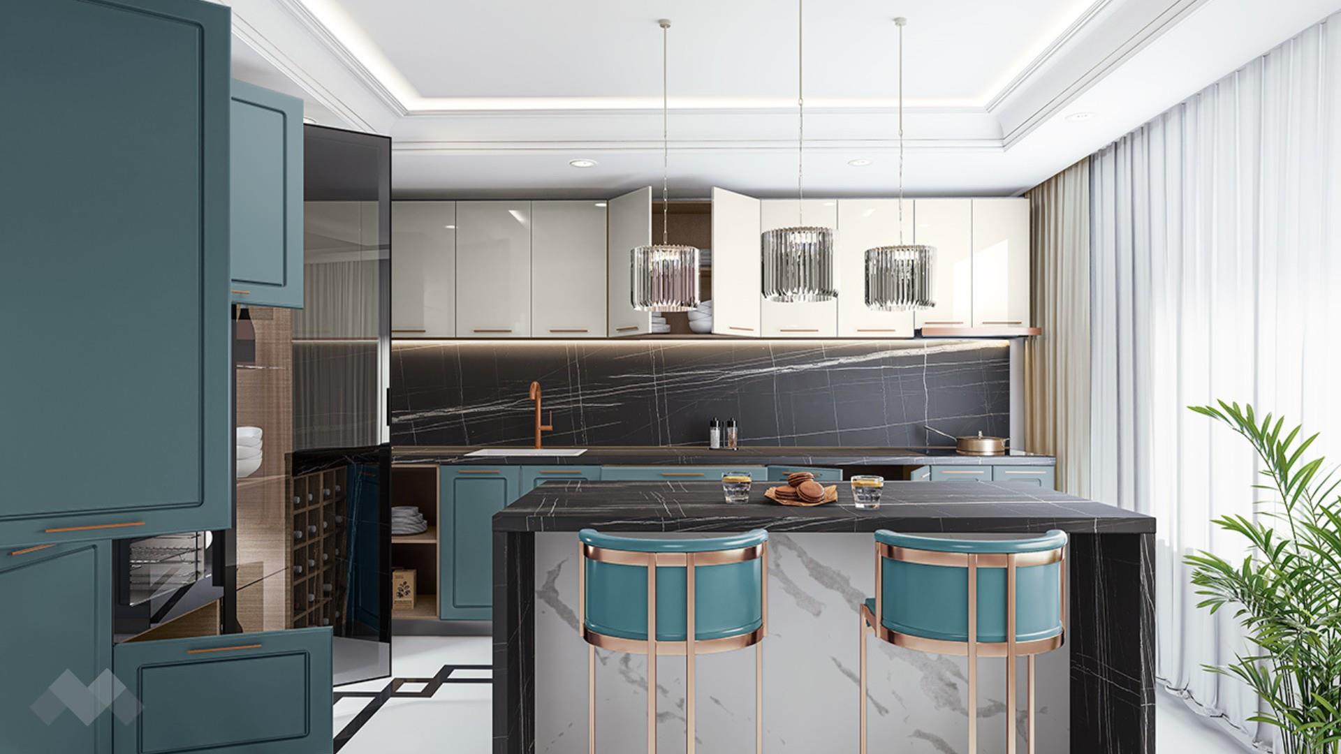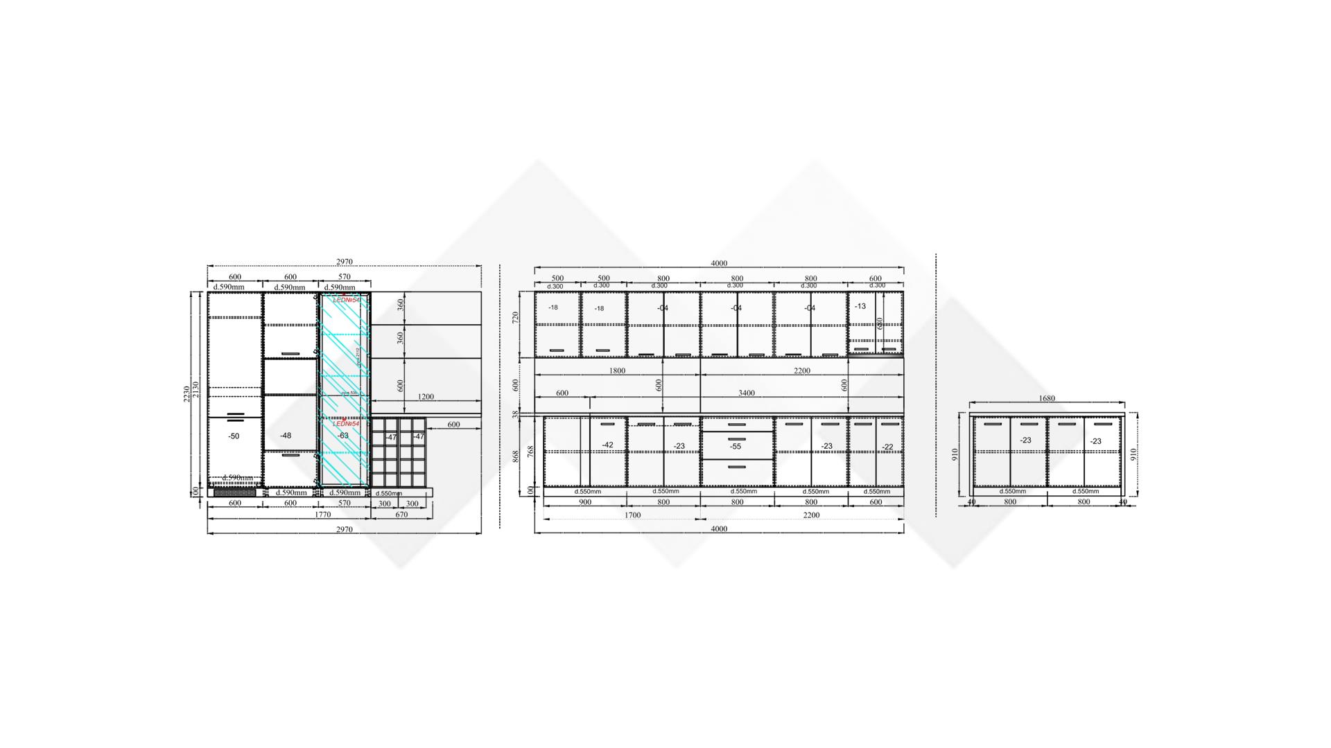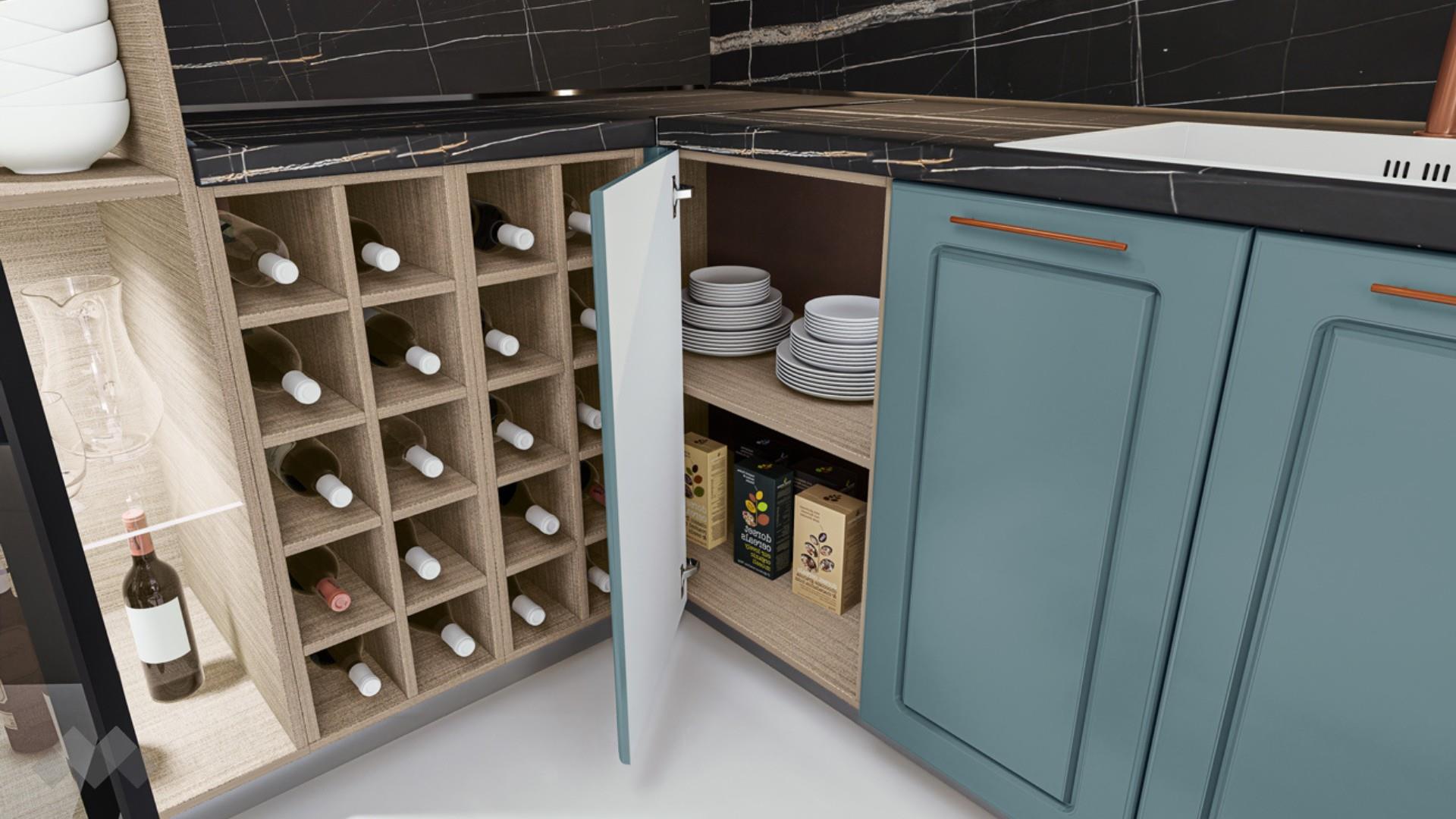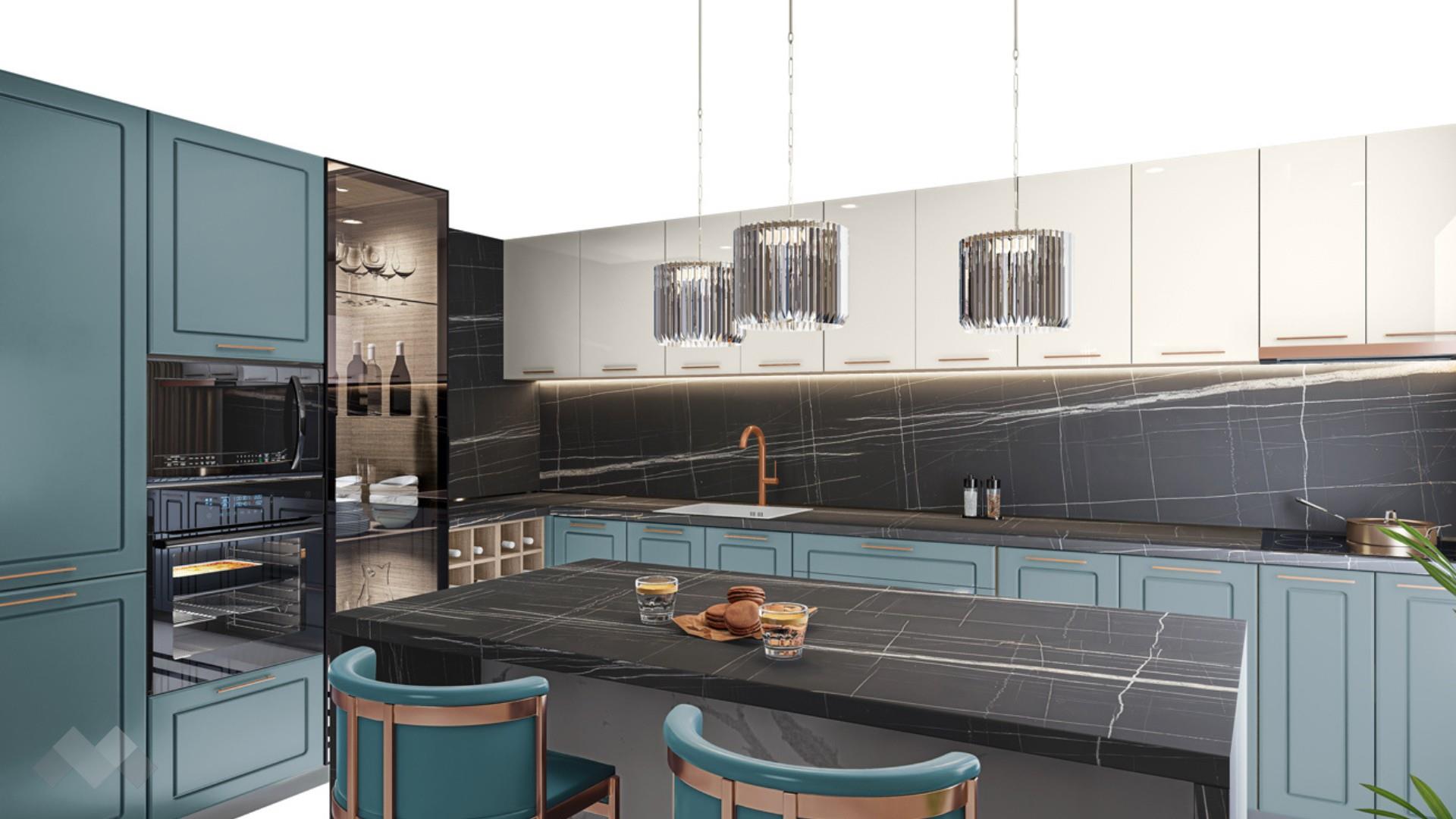 Горния ред шкафове са достатъчно на брой и големина, че да поберат както малко използваните уреди, така и тези, които използваш всчки ден. Шкаф стандартен размер за вграждане на хладилник - за да бъде всичко в синхрон. Шкаф за вграждане на фурна и микровълнова. Долния ред шкафове е функционално подбран - перфектната комбинация на рафтове и чекмеджета, за да поберат често използваните уреди, подправки и посуда. Витринния шкаф е с опушени матови стъкла 4 мм., 4 рафта и LED осветление, за да изглежда още по-елегантно. Островът - допълнително място за съхранение, още площ за работа и място за сладки приказки и хапване.