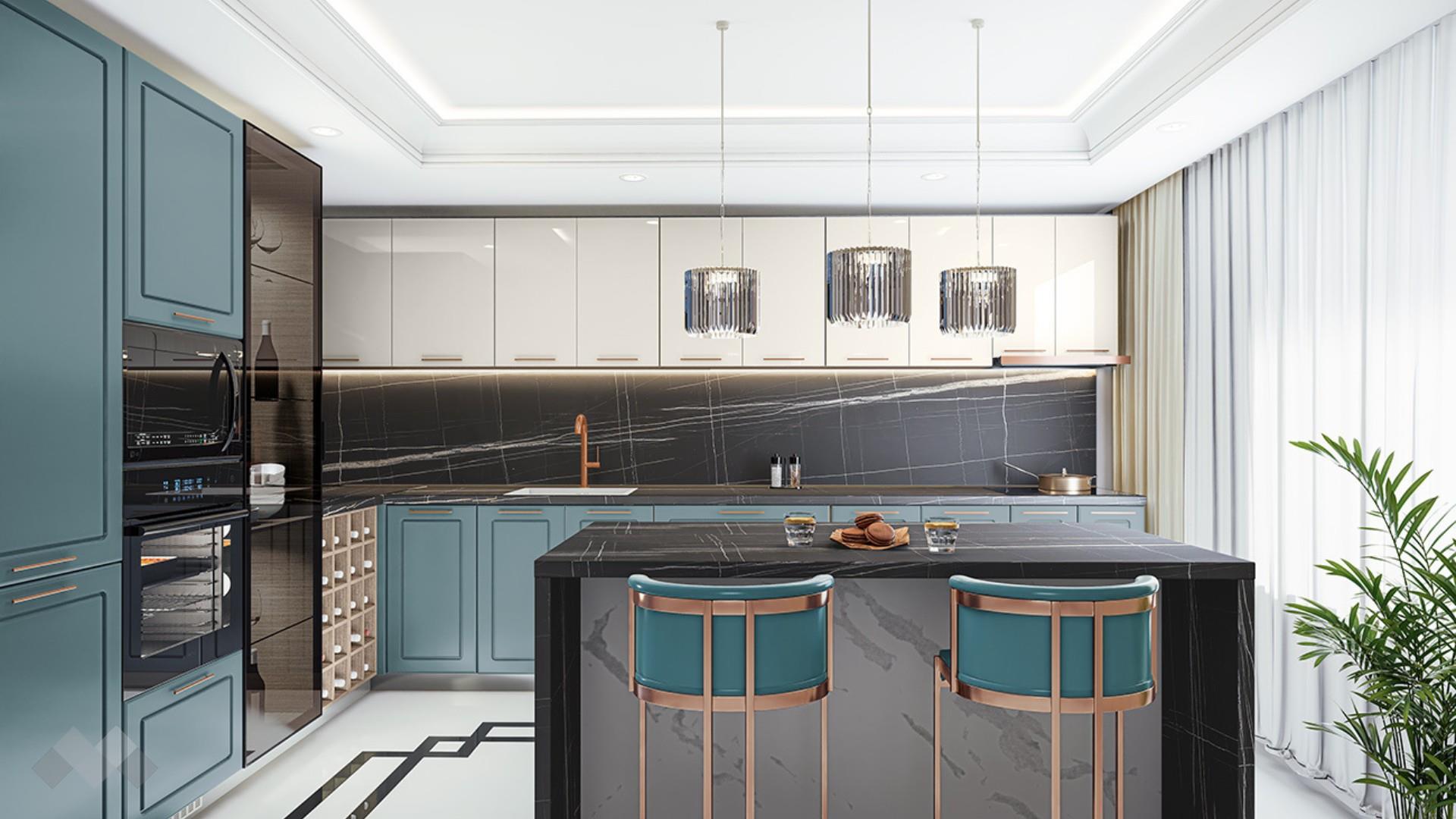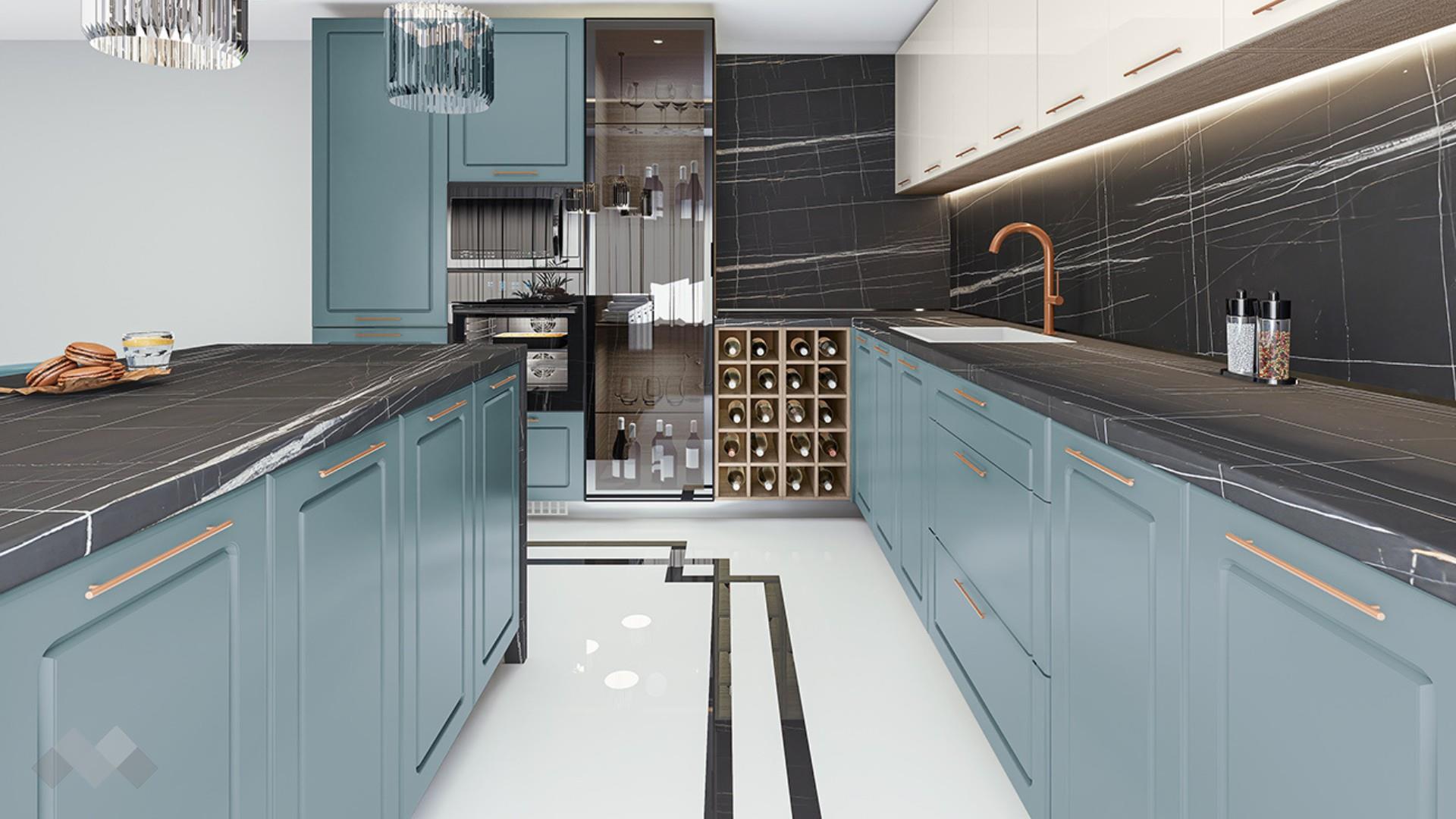 ⭐ Предимства: ✓ 18 мм фолиран МДФ ✓ 16 мм МДФ ✓ функционална и просторна ✓ остров ✓ шкаф за бутилки ✓ шкаф за фурна и микровълнова ✓ шкаф за хладилник ✓ витринен шкаф с LED осветление ✓ шкаф за абсорбатор ✓ витринен шкаф с LED осветление ✓ множество шкафове ✓ чекмеджета ✓ механизъм за плавно затваряне ✓ термоплот ✓ качествена изработка