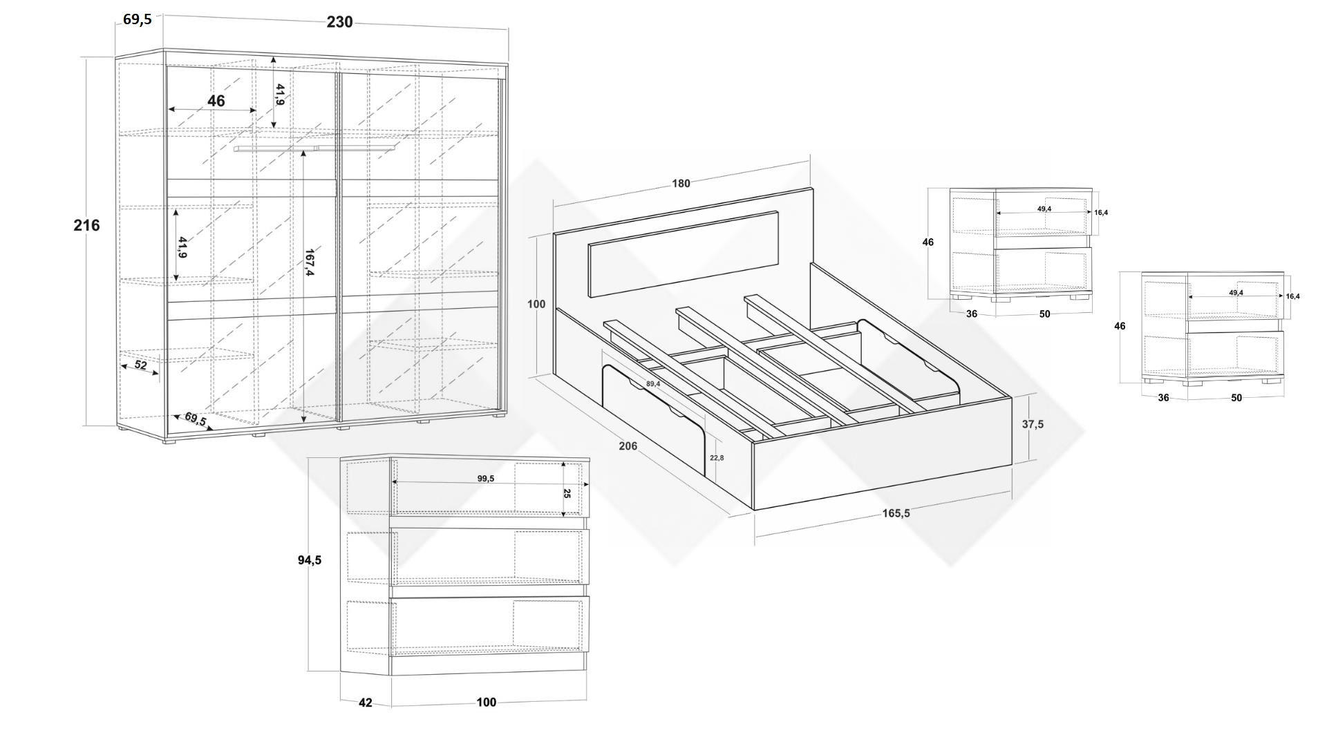 Нощен шкаф (2 бр.): Д: 36 см Ш: 50 см В: 46 см