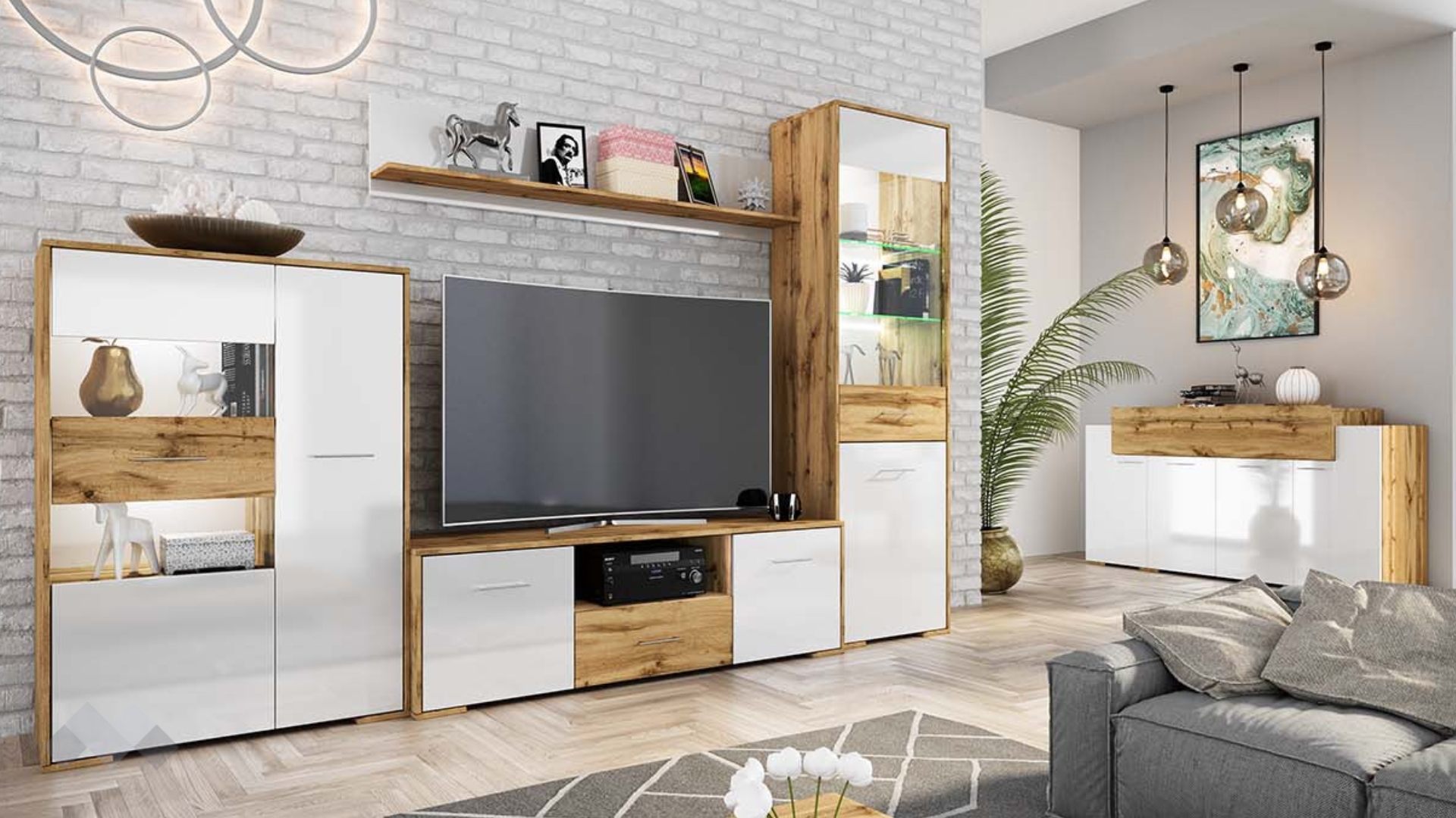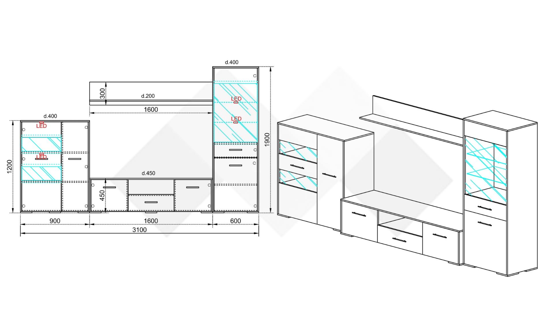 Секцията разполага с висок витринен шкаф – там ще намерят място всичките ти красиви сервизи, любими сувенири или стилни декорации. Допълнителното LED осветление ще акцентира още повече върху секцията и ще я накара да засияе. ТВ шкафът предлага достатъчно пространство, където да поставиш цялата си съпътстваща техника като ТВ приемници, DVD плейъри и други. Можеш да ги организираш, където пожелаеш - в затворено шкафче или отворените ниши. До него се намира още един голям витринен шкаф, в който можеш да прибереш други необходими вещи. Етажерката е прекрасен начин да създадеш допълнително пространство за книги, скъпи спомени като фотографии или сувенири, а може и да аранжираш със стилни декорации и украси – изборът е твой!