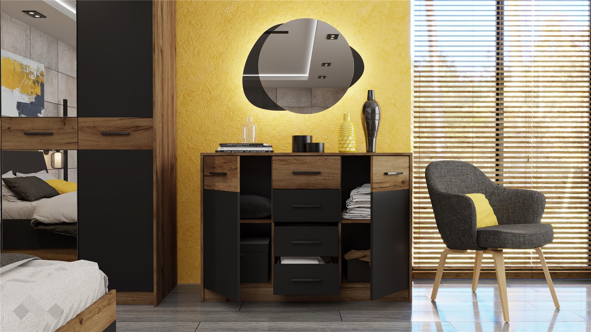 Превърни спалнята си в съвременно бягство с елегантен спален комплект Легрия, който съчетава кафяв дъб пиемона и черно шагре. Модерната композиция, допълнена с контрастиращи текстури, придаващи на интериора характер, стил и усещане за уют.