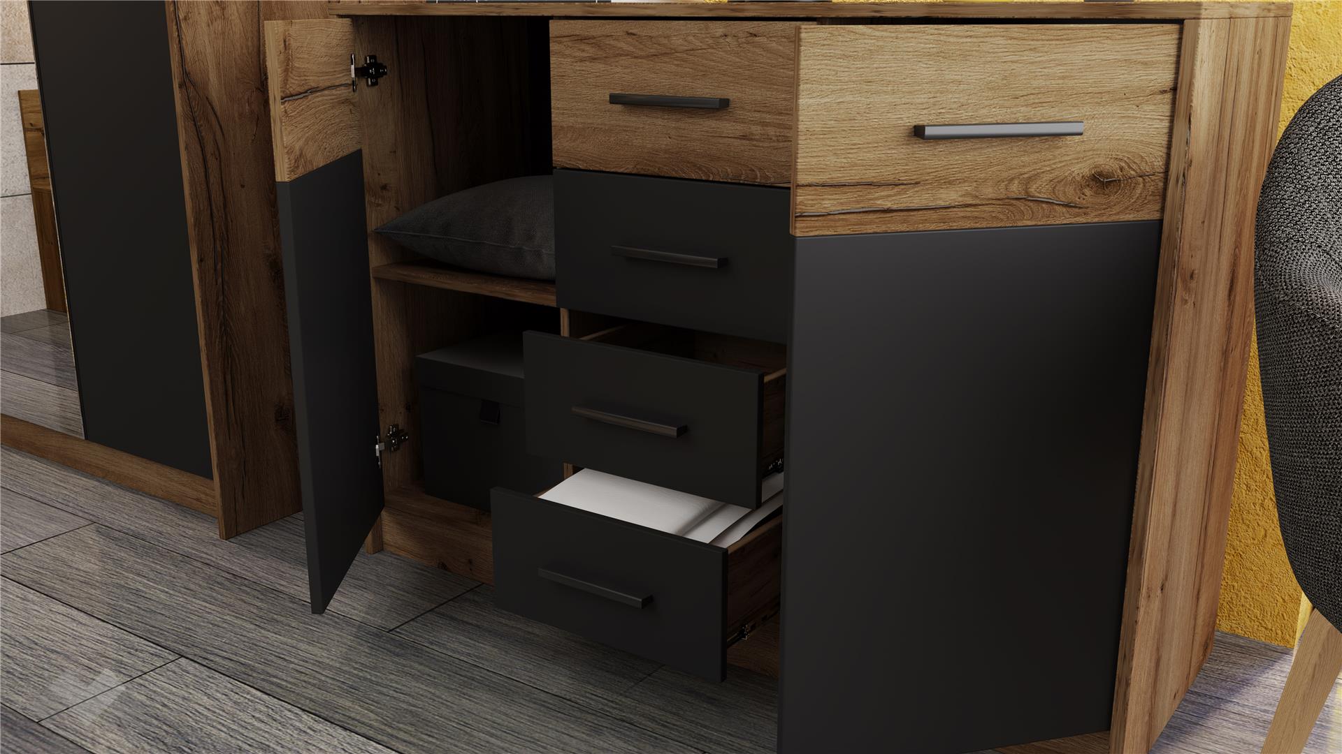 Скринът също ще ти предостави просторно място за вещи или дрехи. Четири чекмеджета и два шкафа с по един рафт. Бельо, дрехи, уреди...можеш да побереш всичко. Плотът на скрина е достатъчен за декорация или козметика.