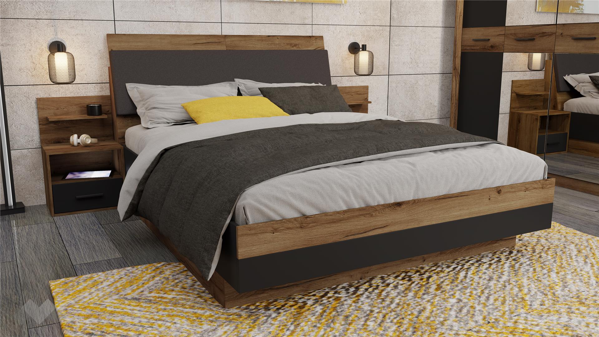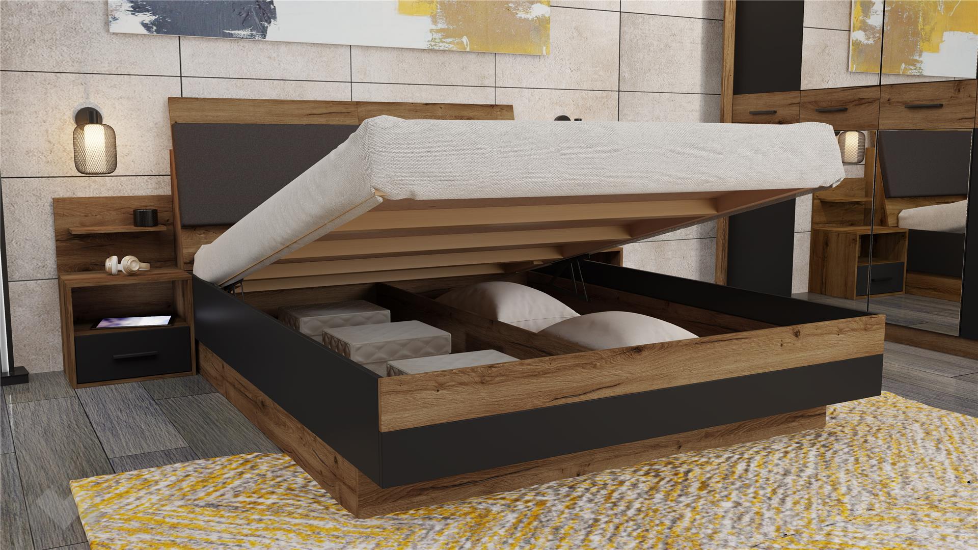 Спалнята е с висока табла с тапицирана част, която е идеална за почивка с книга преди сън или да погледаш филм. Двете нощни шкафчета са изключително функционални - имат малък рафт и плот на оптимална височина, за да може всичко което ти е необходимо да е на една ръка разстояние. Подходяща е за матрак с размер 160/200 и е с включен механизъм за повдигане на матрака, за да използваш максимално пространството под нея.