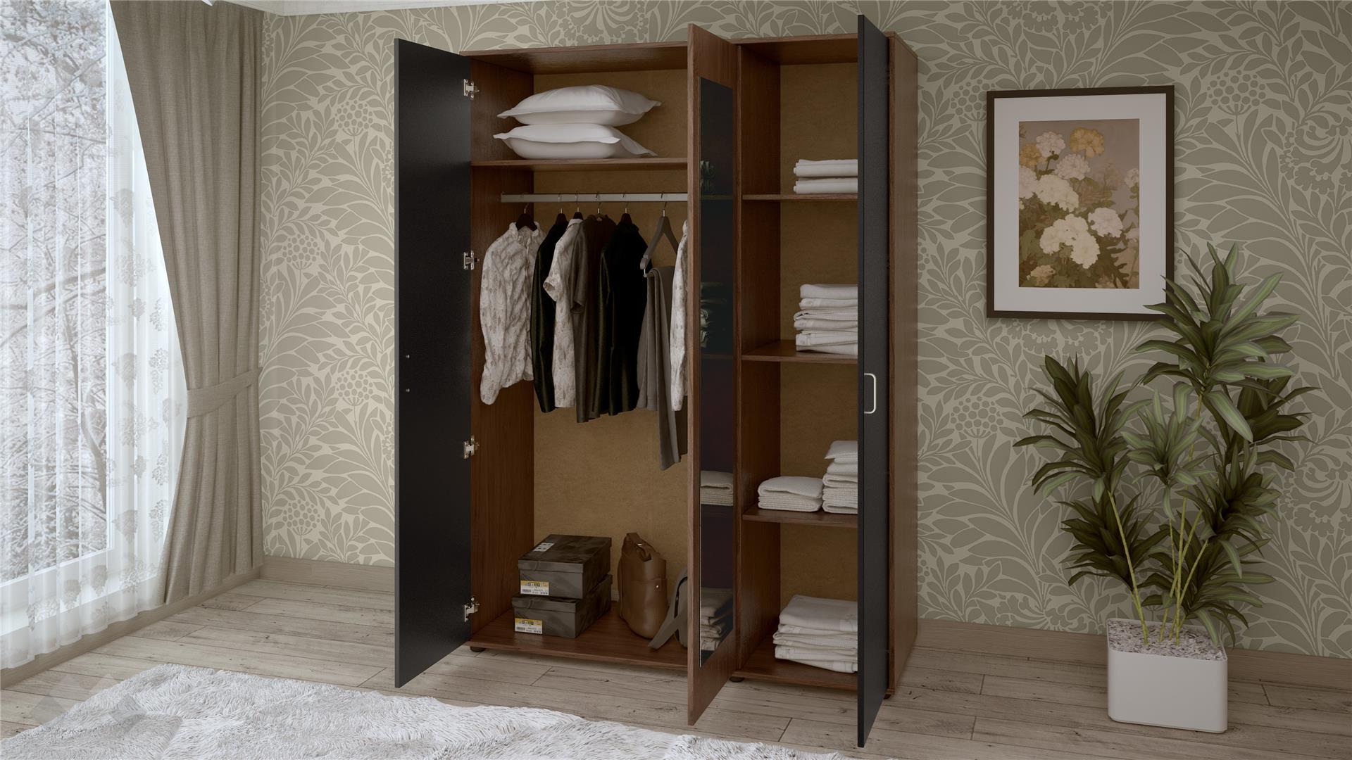 Гардеробът е достатъчно голям, за да побере всичките ти дрехи и предлага практично разпределение с 4 рафта и лост за закачалки, така че да подредиш всичко лесно. Монтираното на вратата огледало дава удобство при избора на тоалет и визуално прави стаята по-голяма и светла.